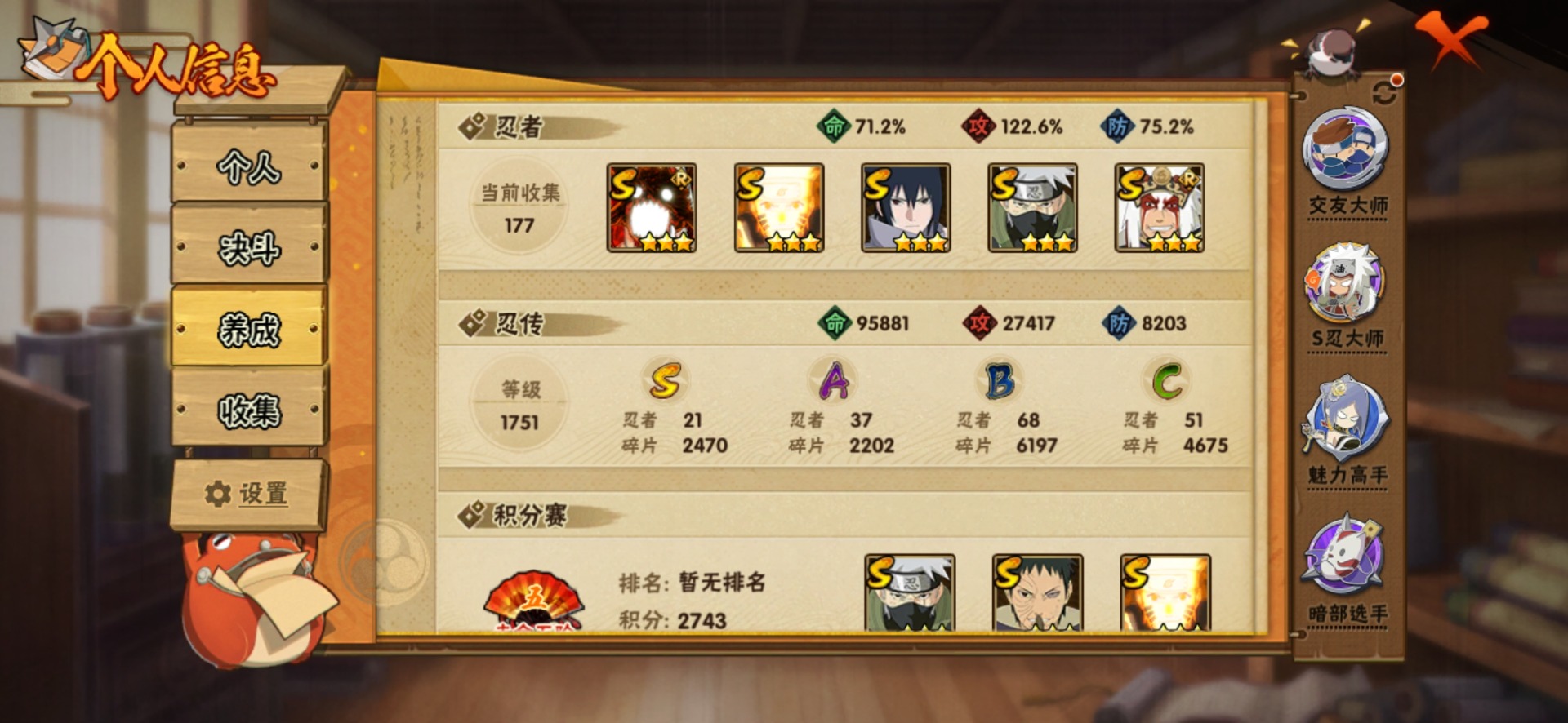 [11881133]V13 21S忍 37A忍 16通灵 688.1W战力 可二次 可修改实名 优质装备:千手扉间「秽土转生」,神秘面具男,迈特凯「死门」,宇智波带土 「忍界大战」,“宇智波斑” 「白面具」,漩涡鸣人 「九喇嘛连结」,大筒木金式「博人传」,神秘面具男 「红夜之刃」,宇智波佐助「永恒万花筒」,千手柱间·木叶创立,宇智波斑「秽土转生·解」,大筒木桃式,宇智波止水「须佐能乎」,旗木卡卡西「须佐能乎」,自来也 「传说中的三忍」,漩涡鸣人 「暴怒·第六尾」 S级忍者:自来也 「舞之豪杰」,宇智波鼬 「须佐能乎」,佩恩「天道」,波风水门,大蛇丸