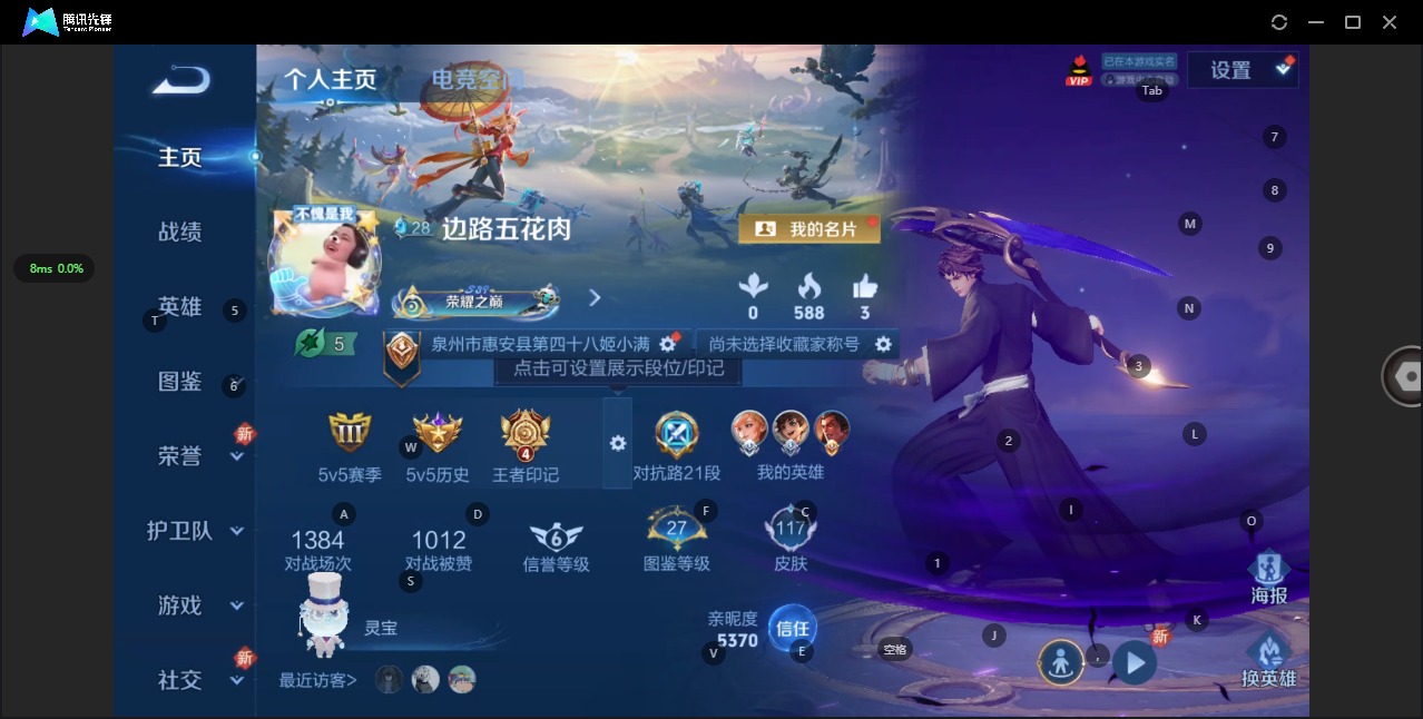 - [12323950]V8 1典藏 21传说 125英雄 277皮肤 可修改实名 优质装备:弑枪猎影(韩信典藏),久胜战神,一念神魔,末日机甲-孙尚香(绿蚂蚱),仲夏夜之梦(大飞蛾),末日机甲-孙策,山海·炽霜斩(李信年限),画中仙,灼幽烈阳,妄想实况,妄想奇谈,霜月吟,澜逐花归海,琥珀纪元马超,黄金天蝎座,涂山容容 传说皮:乘龙·问璇玑(孙尚香年限),乘龙·淬吴钩(孙策年限),貂蝉曦玄引,幻光神枪 珍宝阁皮:万物之道,玩趣恶龙 限定皮:愿照·九州拓(澜年限),夏侯惇霜北刀,傲雪梅枪,五谷丰年,御风骁将(吕布年限),默契交锋-花木兰,乒乒小将,神器·万象笔 史诗皮:灵蛊蚀心,化蝶舞,鸭鸭历险记-刘禅,龙之律动,琥珀纪元伽罗,石田雨龙,蒙犽顽岩魄,谪仙醉月,星界特工,破空之剑,埋骨钱,百相守梦-黄忠,紫霞仙子,苍穹之光,电玩小子(小书包),白龙吟,黄金分割率,特工魅影,千年之狐,永昼,末日机甲-莱西奥,匿光侦查者,江河有灵,百解令(蒙犽),高渐离燃音魔法,魅语,冰冠公主,青蛇,偶像歌手,百相守梦(刘备),暗夜猫娘,末日机甲-吕布,猫狗日记-孙策,猫狗日记-大乔,时之恋人-孙尚香,乱世虎臣,节奏热浪,修罗,女仆咖啡,摇滚巨星,水果甜心,绅士熊喵,天才门将,星夜王子,心灵骇客,功夫厨神,德古拉伯爵,暗隐猎兽者,幽灵船长,鬼剑武藏,暗渊魔法,心灵战警,天秀·启明,舞动绿茵,地狱岩魂,纤云弄巧,拒霜思,缤纷独角兽,乘风破浪,逐浪之夏,月团寄思,水晶猎龙者,曙光守护者,热力回旋,箭羽风息,唤灵魅影,金属风暴,圣诞狂欢,圣诞恋歌,鹰眼统帅,赏金猎手,未来纪元-赵云