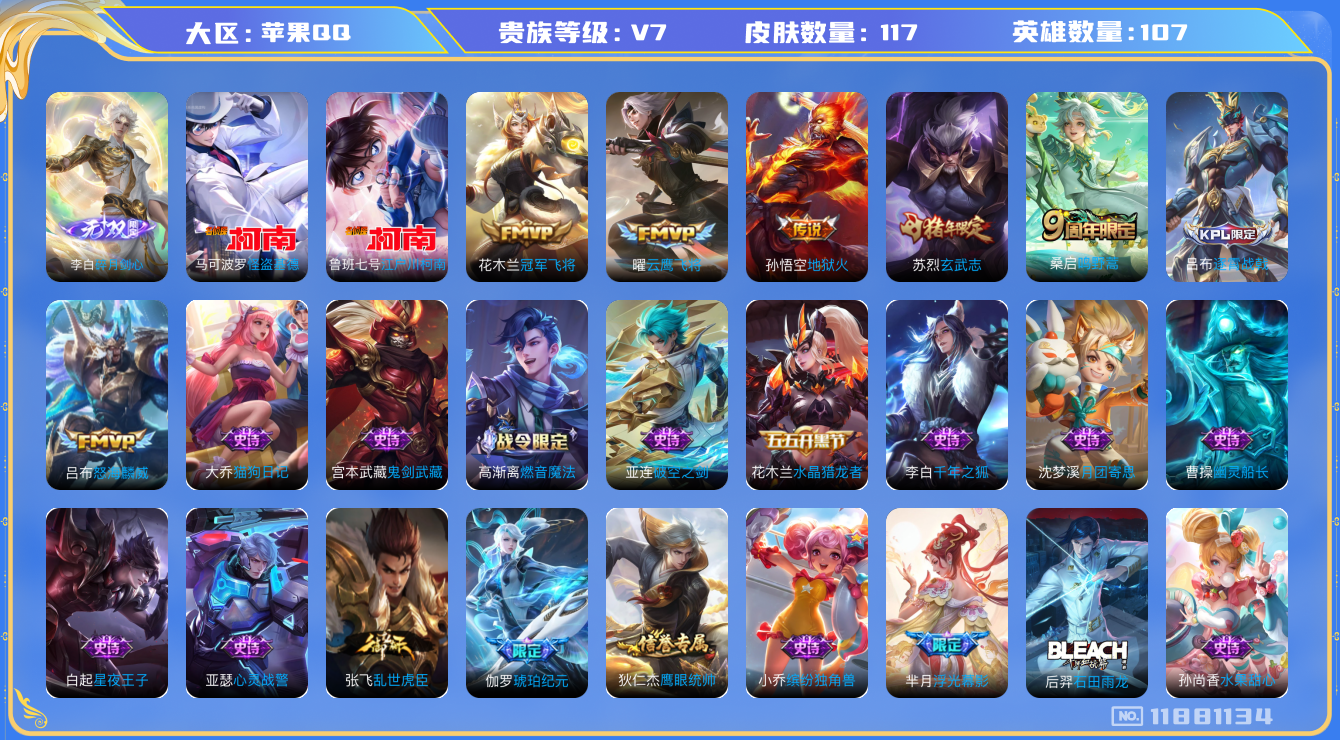 [11881134]V7 1无双 2珍品传说 5传说 107英雄 117皮肤 可修改实名 优质装备:碎月剑心(李白无双),江户川柯南,怪盗基德,冠军飞将,云鹰飞将(小将军),地狱火 限定皮:逐霄战戟,鸣野蒿,怒海麟威,玄武志(苏烈年限) 史诗皮:龙之律动,石田雨龙,破空之剑,芈月浮光幕影,琥珀纪元伽罗,百相守梦-百里守约,紫霞仙子,黄金分割率,千年之狐,高渐离燃音魔法,冰冠公主,偶像歌手,晚萤,猫狗日记-大乔,乱世虎臣,水果甜心,天才门将,星夜王子,幽灵船长,鬼剑武藏,心灵战警,纤云弄巧,缤纷独角兽,月团寄思,水晶猎龙者,原初追逐者,圣诞狂欢,鹰眼统帅,魅力维加斯,未来纪元-赵云
