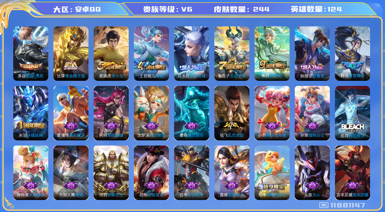 [11881147]V6 1典藏 2传说 124英雄 244皮肤 可修改实名 荣耀水晶:鸣剑·曳影 传说皮:黄金狮子座 珍宝阁皮:优雅恋人,蔷薇恋人 限定皮:鸣野蒿,至尊宝,傲雪梅枪,五谷丰年,冰锋战神,梁祝,李小龙,默契交锋-花木兰 史诗皮:鸭鸭历险记-刘禅,龙之律动,石田雨龙,紫霞仙子,苍穹之光,特工魅影,千年之狐,冰冠公主,偶像歌手,魅语,暗夜猫娘,龙骑士(小龙虾),末日机甲-吕布,猫狗日记-孙策,乱世虎臣,女仆咖啡,摇滚巨星,水果甜心,星夜王子,心灵骇客,功夫厨神,暗隐猎兽者,幽灵船长,鬼剑武藏,心灵战警,天秀·启明,纤云弄巧,繁星吟游(呼啦呼啦),缤纷独角兽,乘风破浪,逐浪之夏,月团寄思,水晶猎龙者,金属风暴,圣诞狂欢,圣诞恋歌,鹰眼统帅,魅力维加斯,黎明之约,无心,未来纪元-赵云