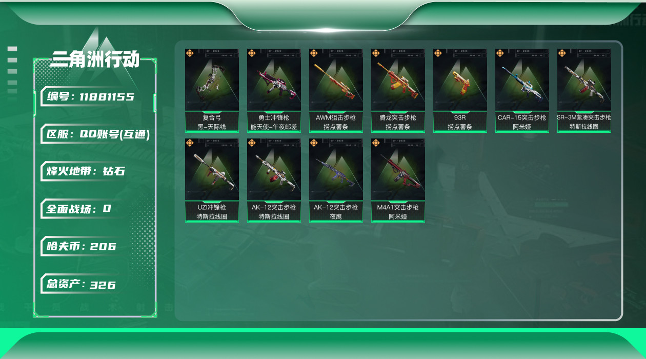 [11881155]总资产:326.3M 11传说枪械 哈夫币:206K 可二次 可修改实名 优质装备:顶级安全箱(3x3) 烽火地带段位:钻石 全面战场段位:无段位 传说武器皮肤:UZI冲锋枪-特斯拉线圈,AWM狙击步枪-捞点薯条,腾龙突击步枪-捞点薯条,93R-捞点薯条,AK-12突击步枪-特斯拉线圈,SR-3M紧凑突击步枪-特斯拉线圈,勇士冲锋枪-能天使-午夜邮差,复合弓-黑-天际线,M4A1突击步枪-阿米娅,CAR-15突击步枪-阿米娅,AK-12突击步枪-夜鹰