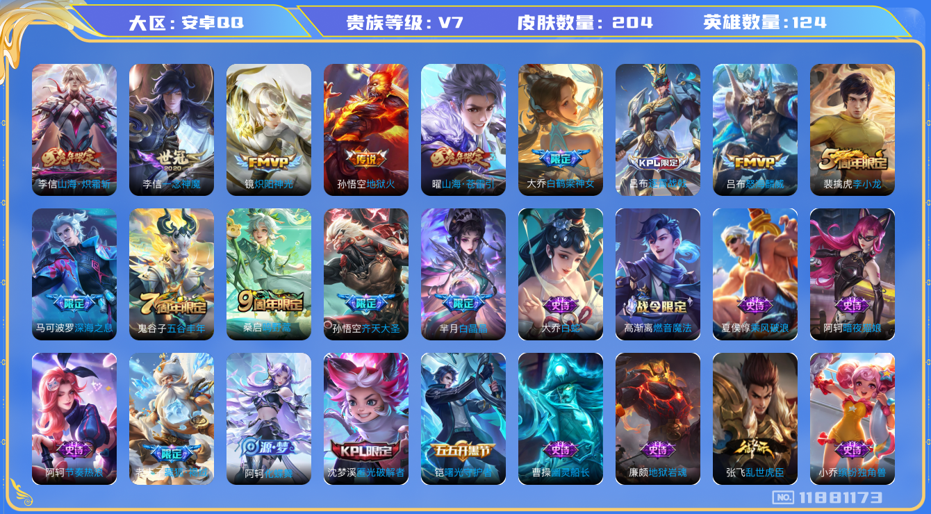 [11881173]V7 9传说 124英雄 204皮肤 可修改实名 优质装备:炽阳神光,一念神魔,地狱火,山海·炽霜斩(李信年限),山海·苍雷引(电光曜子) 珍宝阁皮:玩趣恶龙 限定皮:逐霄战戟,鸣野蒿,白鹤梁神女,白晶晶,齐天大圣,怒海麟威,五谷丰年,李小龙,深海之息(深海大菠萝) 史诗皮:化蝶舞,星界战将,龙之律动,藏狐·褐绒,石田雨龙,破空之剑,谪仙醉月,紫霞仙子,黄金分割率,特工魅影,千年之狐,永昼,匿光破解者,百相守梦(关羽),电玩·爆裂旋风,江河有灵,百解令(蒙犽),高渐离燃音魔法,蒙恬荣光圣徽,白蛇,暗夜猫娘,魅语,无限星赏官,冰冠公主,青蛇,末日机甲-吕布,猫狗日记-孙策,乱世虎臣,节奏热浪,修罗,女仆咖啡,摇滚巨星,水果甜心,星夜王子,心灵骇客,功夫厨神,暗隐猎兽者,幽灵船长,鬼剑武藏,心灵战警,舞动绿茵,地狱岩魂,缤纷独角兽,乘风破浪,逐浪之夏,水晶猎龙者,曙光守护者,圣诞恋歌,鹰眼统帅,魅力维加斯,无心,未来纪元-赵云