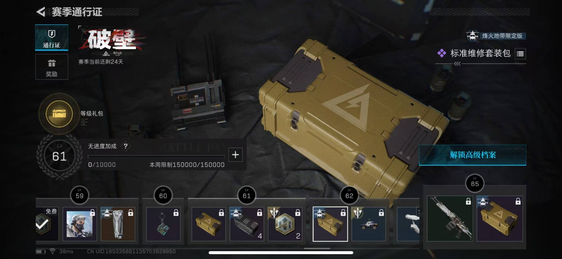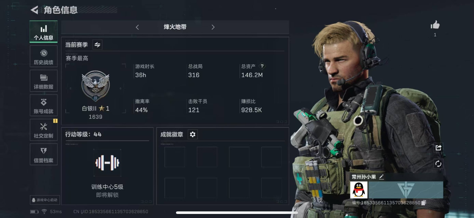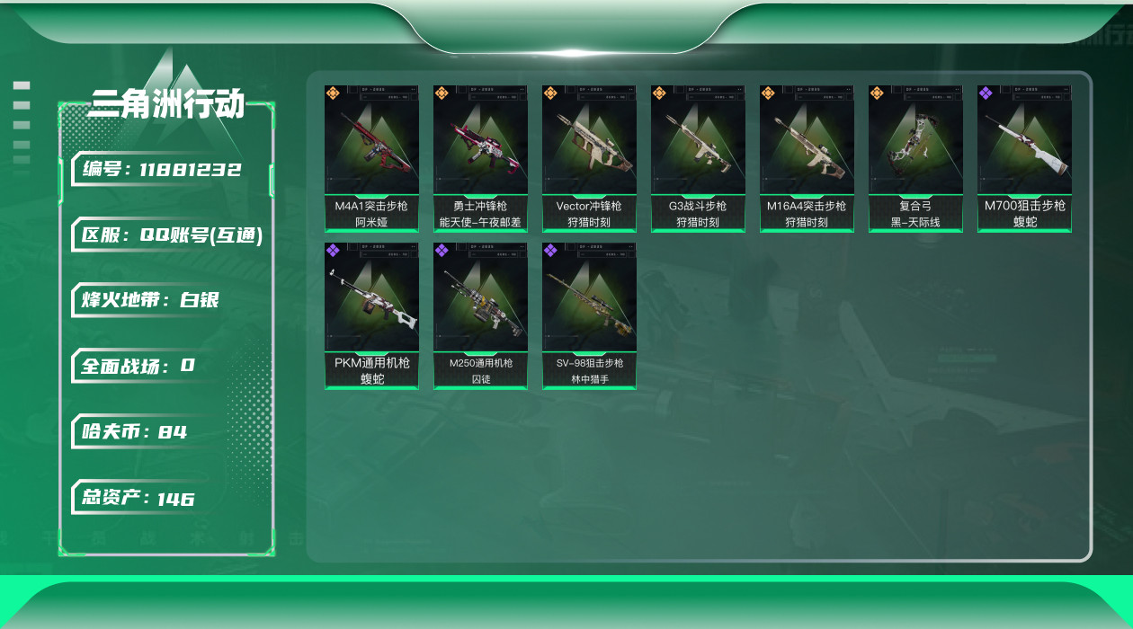 [11881232]总资产:146.2M 6传说枪械 哈夫币:84.031K 进阶安全箱(2×2)9.15号到期 可二次 可修改实名 烽火地带段位:白银 全面战场段位:无段位 传说武器皮肤:M16A4突击步枪-狩猎时刻,M4A1突击步枪-阿米娅,复合弓-黑-天际线,Vector冲锋枪-狩猎时刻,G3战斗步枪-狩猎时刻,勇士冲锋枪-能天使-午夜邮差 史诗武器皮肤:M700狙击步枪-蝮蛇,PKM通用机枪-蝮蛇,SV-98狙击步枪-林中猎手,M250通用机枪-囚徒