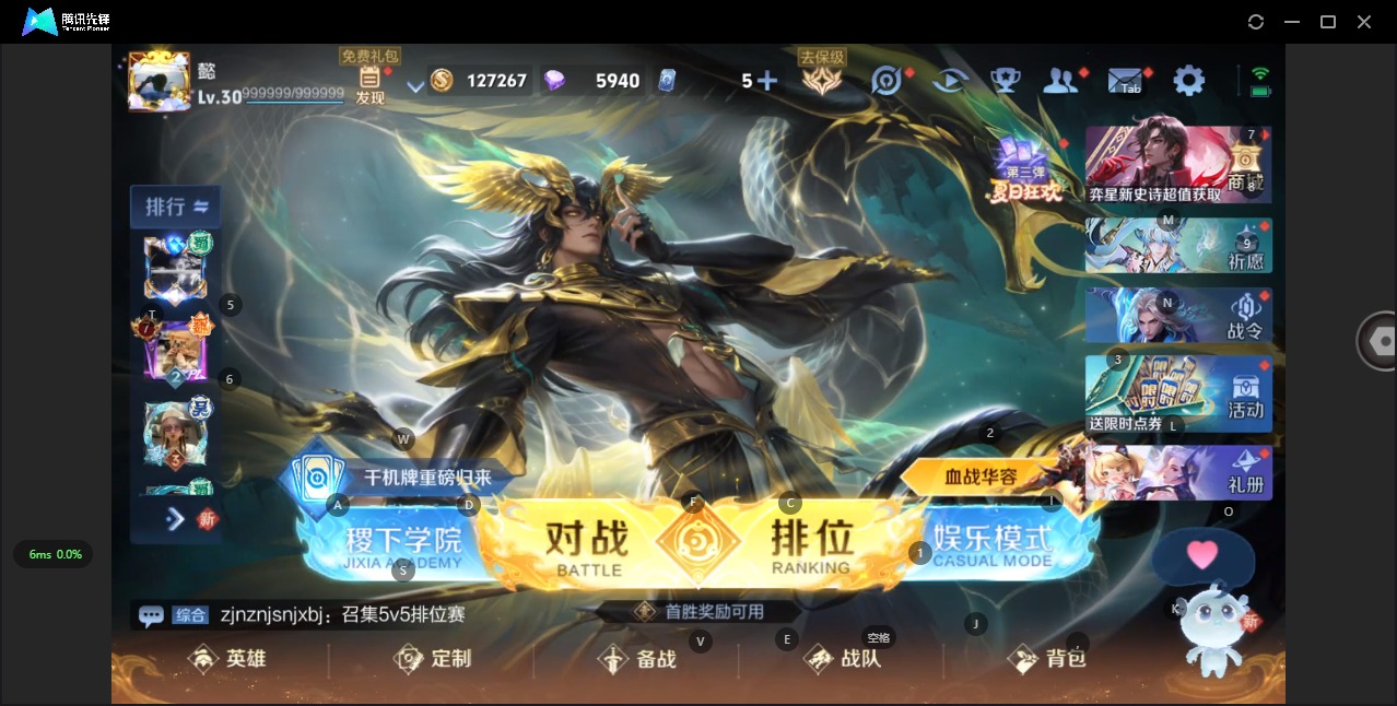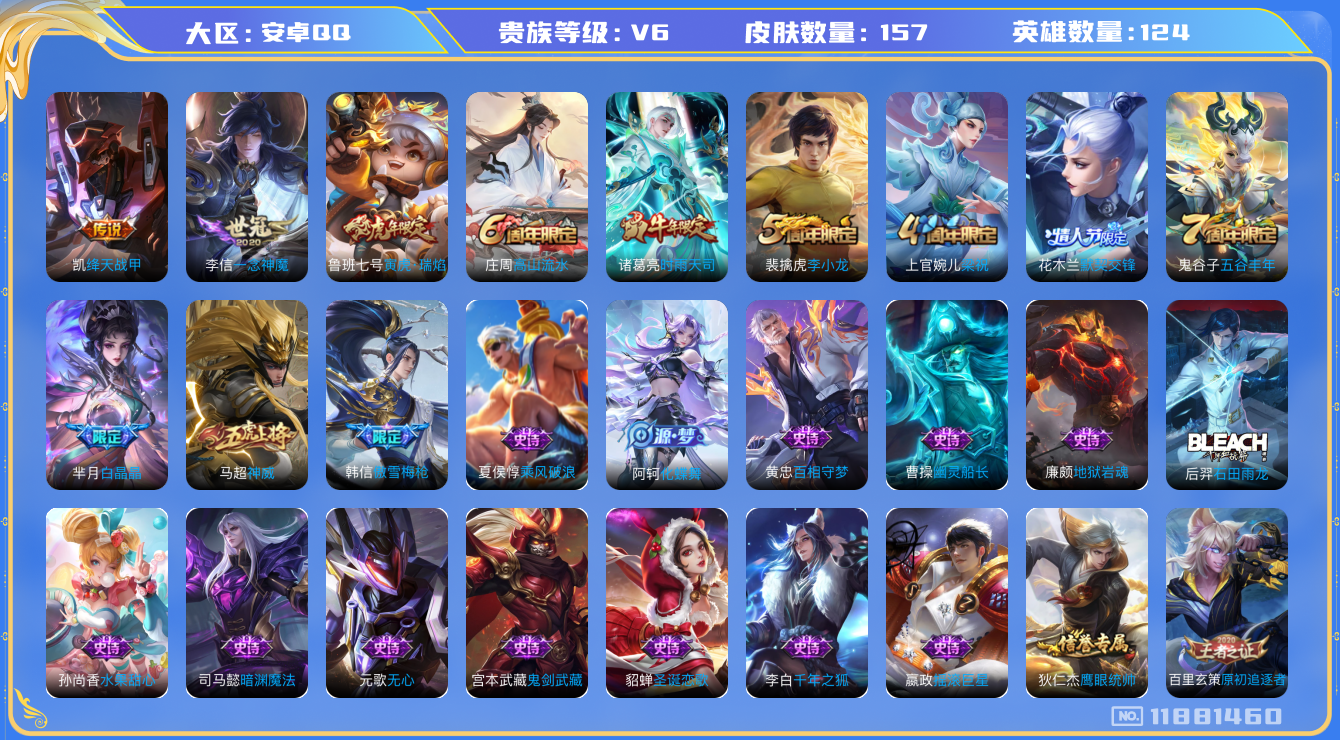 [11881460]V6 4传说 124英雄 157皮肤 可修改实名 优质装备:绛天战甲(鸡嘴战神),一念神魔 珍宝阁皮:优雅恋人,蔷薇恋人 限定皮:傲雪梅枪,白晶晶,时雨天司(水龙头),神威(电光马子),高山流水,五谷丰年,梁祝,李小龙,默契交锋-花木兰,寅虎·瑞焰(虎皮蛋子) 史诗皮:化蝶舞,石田雨龙,百相守梦-黄忠,特工魅影,千年之狐,冰冠公主,修罗,女仆咖啡,摇滚巨星,水果甜心,幽灵船长,鬼剑武藏,暗渊魔法,地狱岩魂,纤云弄巧,繁星吟游(呼啦呼啦),拒霜思,乘风破浪,逐浪之夏,金属风暴,原初追逐者,圣诞恋歌,鹰眼统帅,魅力维加斯,黎明之约,无心,未来纪元-赵云
