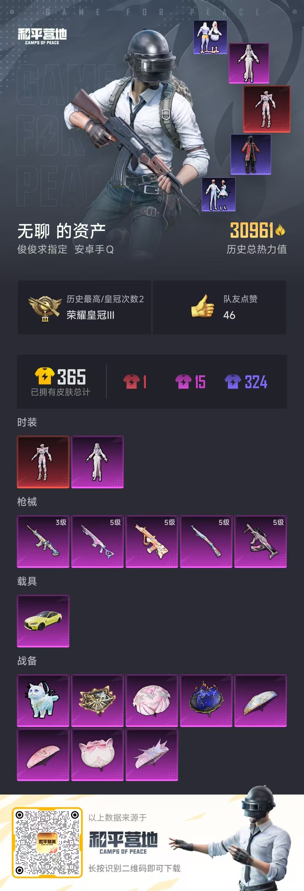 - [11794538]1粉装 4特效枪 5印记 可二次 可修改实名 优质装备:SCAR-L-锦绣绵绵,M416电玩时刻,绯穹魔姬,Kar98K-巳巳如意 热门装扮:鹰眼刺客,呆萌铁蟹,深海小丑鱼 稀有枪皮:DP-28-豹影疾电 五级特效枪:五级Kar98K-巳巳如意,五级DP-28-豹影疾电,五级M416-电玩时刻,五级SCAR-L-锦绣绵绵 紫色装扮:SS31特训套装,旭日情侣,SS30特训套装,云朵鹅,彩虹兔,雪绒豹,SS33特训套装,顶瓜瓜,灵公主,酒红色名流,长空猛禽,霓虹街区,缤纷果语,蓝彩潮人,蓝色运动,街头潮人,无面战甲,绛羽幽主,魅力单车,鹤鸣,黄色伏地魔,黄色名流,黑色伏地魔,龟仙人,龙魂突击队,蝶变,香桃花海,海岛探路者,深蓝色名流,幻影武者,湖蓝色名流,白色伏地魔,破晓战魂,破蛋小黄鸡,空岛之星,灼焰舞者,SS29特训,狂花道·娜可露露,星途旅人,创世·幻影,白光莹,纯真浪花,热情海星,曼妙人鱼,SS28特训,卖崽青蛙,奶油梦幻熊,红潮炫舞,鱼渊荷华,燕燕于飞,巳巳如意,青团波波,糖糖葫芦,竞技名士,情公主,焰鹰斗篷,幻羽潜行,幽夜迷踪,SS27特训,蝶吟花词,小丑鱼,SS26特训,大橘大利,耀粉歌者,SS32特训服(SS32特训套装),青玉碎影,绯格组合,白糯汤圆,恋语绒绒,漫步者,冰冻风暴 优质战备:创世·救赎降落伞,精灵梦叶罗丽降落伞,星途旅人降落伞,幻彩电音降落伞,临安公主降落伞