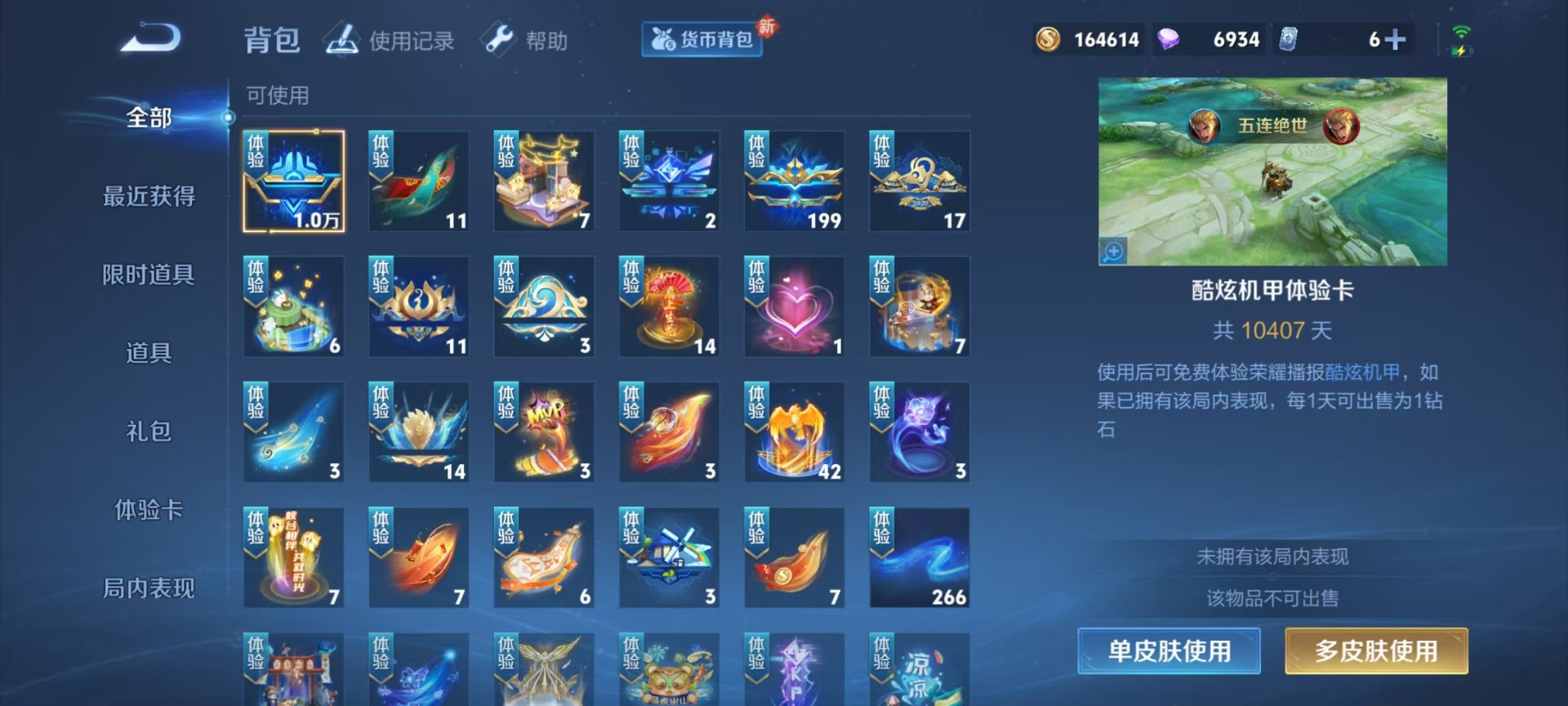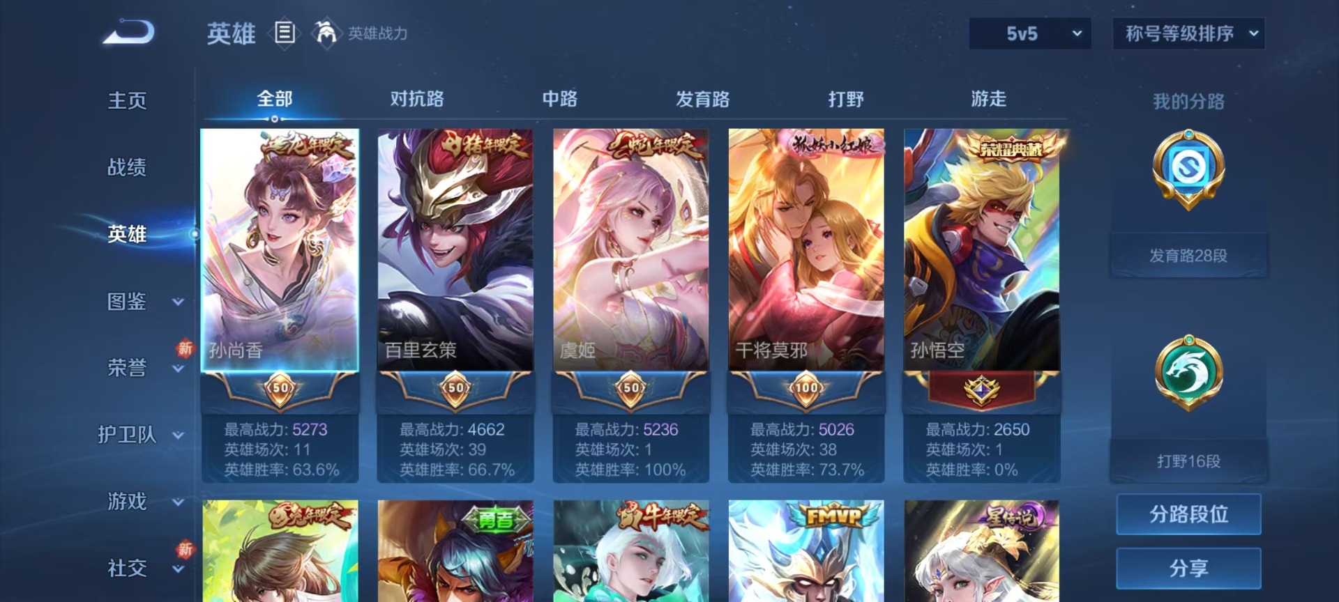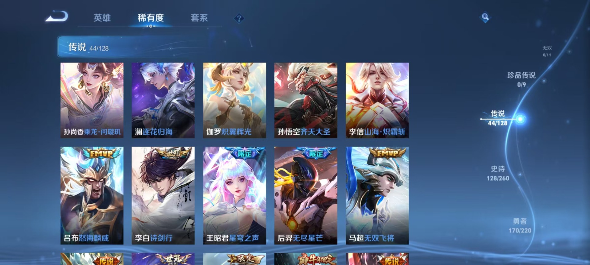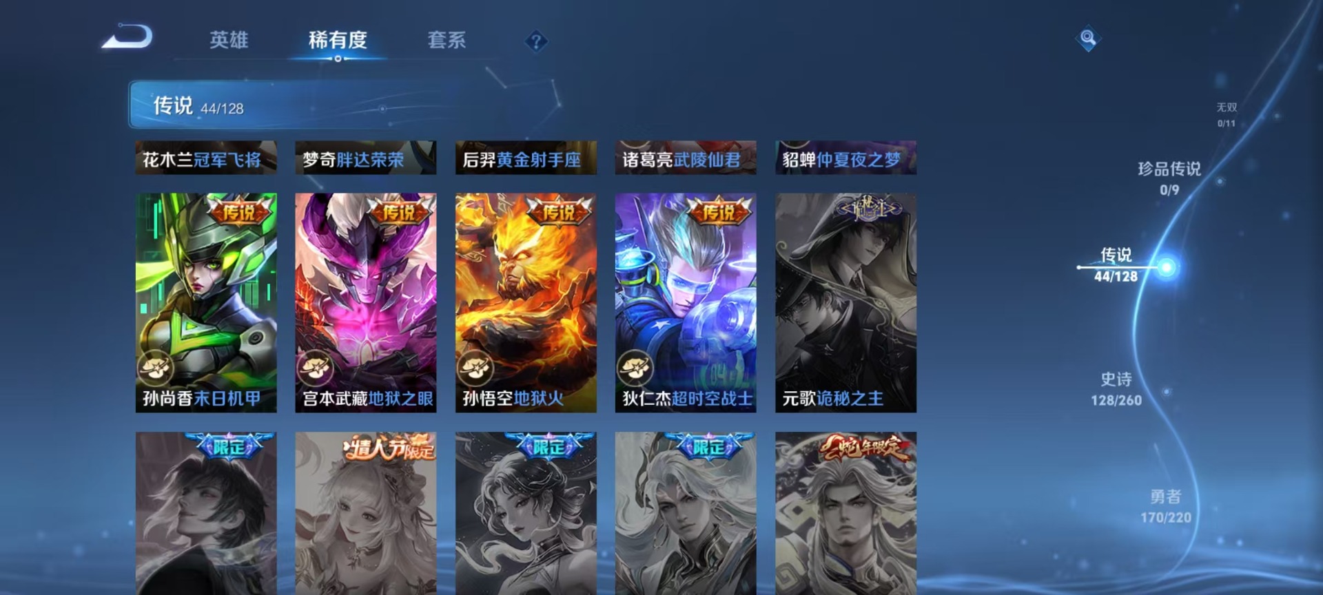 - PX_2082811-贵族等级: V5 英雄数: 121 皮肤数: 101 星传说: 幽冥之眼 传说皮: 黄金射手座,冠军飞将,云鹰飞将,澜逐花归海 限定皮: 游园惊梦,白鹤梁神女,蜜橘之夏,凤求凰,高山流水,寅虎·心曲