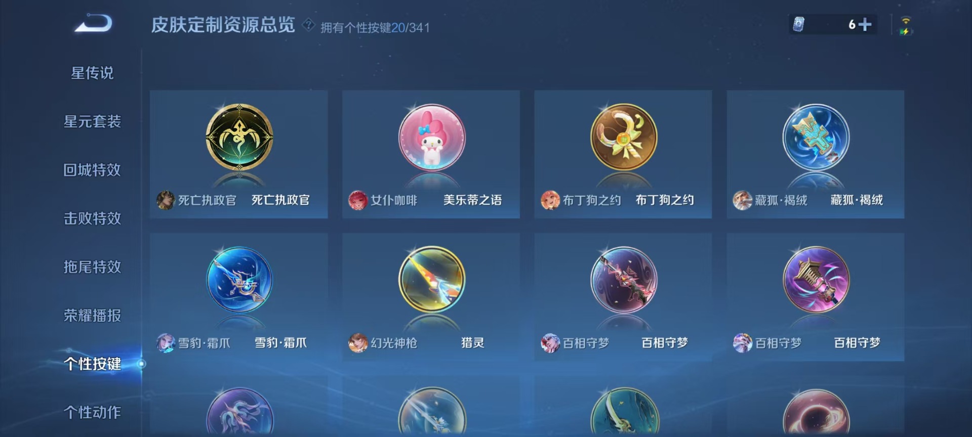 夏侯惇匿光决锋者,黄忠烈魂,伽罗天狼溯光者,赵云百木心枪,赵云龙胆,典韦岱宗,后羿无尽星芒,镜匿光追影者,诸葛亮时雨天司,裴擒虎李小龙,裴擒虎天狼狩猎者,上官婉儿梁祝,李白诗剑行,马可波罗山海·玄木吟,艾琳陌上桑,桑启鸣野蒿,猪八戒猪悟能,孙悟空孙行者,孙悟空至尊宝,百里玄策白虎志,马超神威,赵云引擎之心,韩信傲雪梅枪,韩信飞衡,澜愿照·九州拓,虞姬愿照·岁时盈,王昭君星穹之声,关羽冰锋战神