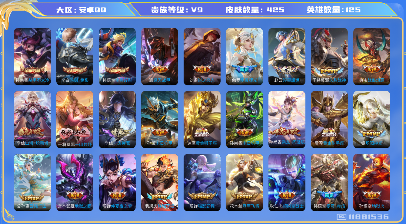 [11881536]V9 3典藏 44传说 125英雄 425皮肤 可修改实名 优质装备:杀手不太冷,鸣剑·曳影,全息碎影(猴子典藏),黄金狮子座,黄金射手座,冠军飞将,绛天战甲(鸡嘴战神),猫影幻舞,久胜战神,炽阳神光,一念神魔,云霓雀翎,末日机甲-孙尚香(绿蚂蚱),地狱火,仲夏夜之梦(大飞蛾),零号·赤焰,地狱之眼,胖达荣荣,李逍遥,时之恋人-刘备(电焊工),淬星耀世,超时空战士-狄仁杰,末日机甲-孙策,无双飞将,山海·炽霜斩(李信年限),炽翼辉光(娃娃菜牛角包),澜逐花归海,千山共赴,涂山容容 传说皮:乘龙·问璇玑(孙尚香年限),貂蝉曦玄引,典韦战鼓燎原,死亡执政官,云诺千山,祥瑞亨通,幻光神枪 珍宝阁皮:妄想食味,胡桃夹子,优雅恋人,蔷薇恋人 限定皮:愿照·九州拓(澜年限),愿照·岁时盈(虞姬年限),逐霄战戟,陌上桑,鸣野蒿,至尊宝,白虎志(电光耗子),武陵仙君(小桃花),傲雪梅枪,星穹之声,时雨天司(水龙头),神威(电光马子),飞衡(韩信年限),遇见飞天,高山流水,诗剑行,齐天大圣,匿光决锋者,怒海麟威,五谷丰年,冰锋战神,梁祝,天狼狩猎者,龙胆,烈魂,岱宗(典韦年限),天狼溯光者,李小龙,孙行者,猪悟能,引擎之心,匿光追影者,百木心枪,无尽星芒,山海·玄木吟(马可年限) 史诗皮:鸭鸭历险记-刘禅,器灵·浮梦炉,化蝶舞,灵蛊蚀心,谪仙醉月,龙之律动,雪豹·霜爪,藏狐·褐绒,破空之剑,东方月初,埋骨钱,琥珀纪元伽罗,百相守梦-百里守约,星界特工,紫霞仙子,苍穹之光,电玩小子(小书包),白龙吟,黄金分割率,特工魅影,千年之狐,永昼,江河有灵,浮梦罗烟,魅语,高渐离燃音魔法,无限星赏官,冰冠公主,偶像歌手,暗夜猫娘,龙骑士(小龙虾),末日机甲-吕布,猫狗日记-孙策,猫狗日记-大乔,时之恋人-孙尚香,乱世虎臣,节奏热浪,修罗,女仆咖啡,摇滚巨星,水果甜心,绅士熊喵,天才门将,星夜王子,心灵骇客,时之奇旅-安琪拉,功夫厨神,德古拉伯爵,暗隐猎兽者,幽灵船长,鬼剑武藏,暗渊魔法,心灵战警,乐园奇幻夜,天秀·启明,舞动绿茵,地狱岩魂,诗语江南,纤云弄巧,拒霜思,缤纷独角兽,乘风破浪,逐浪之夏,月团寄思,水晶猎龙者,曙光守护者,热力回旋,箭羽风息,金属风暴,原初追逐者,圣诞狂欢,圣诞恋歌,鹰眼统帅,暗夜贵公子,魅力维加斯,黎明之约,赏金猎手,无心,未来纪元-赵云