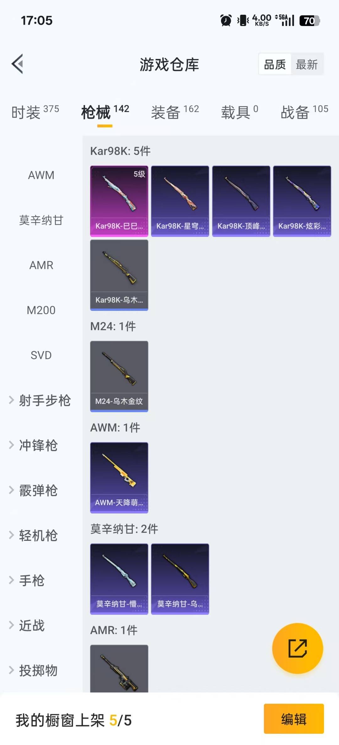 M416-心之恋语,GROZA-镜光银凌,AUG-暖羊咩咩,Kar98K-巳巳如意,Mk14-精灵梦叶罗丽