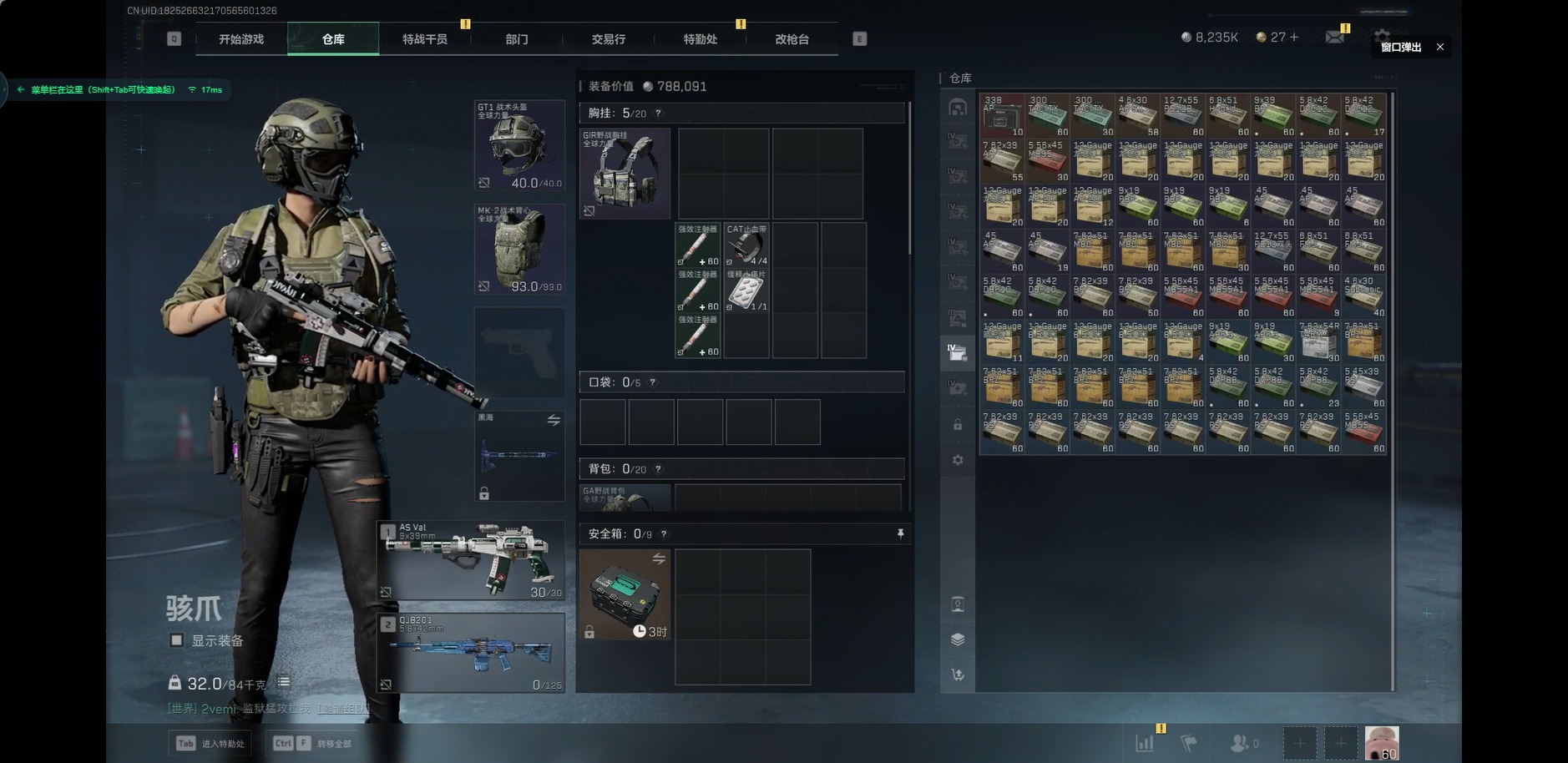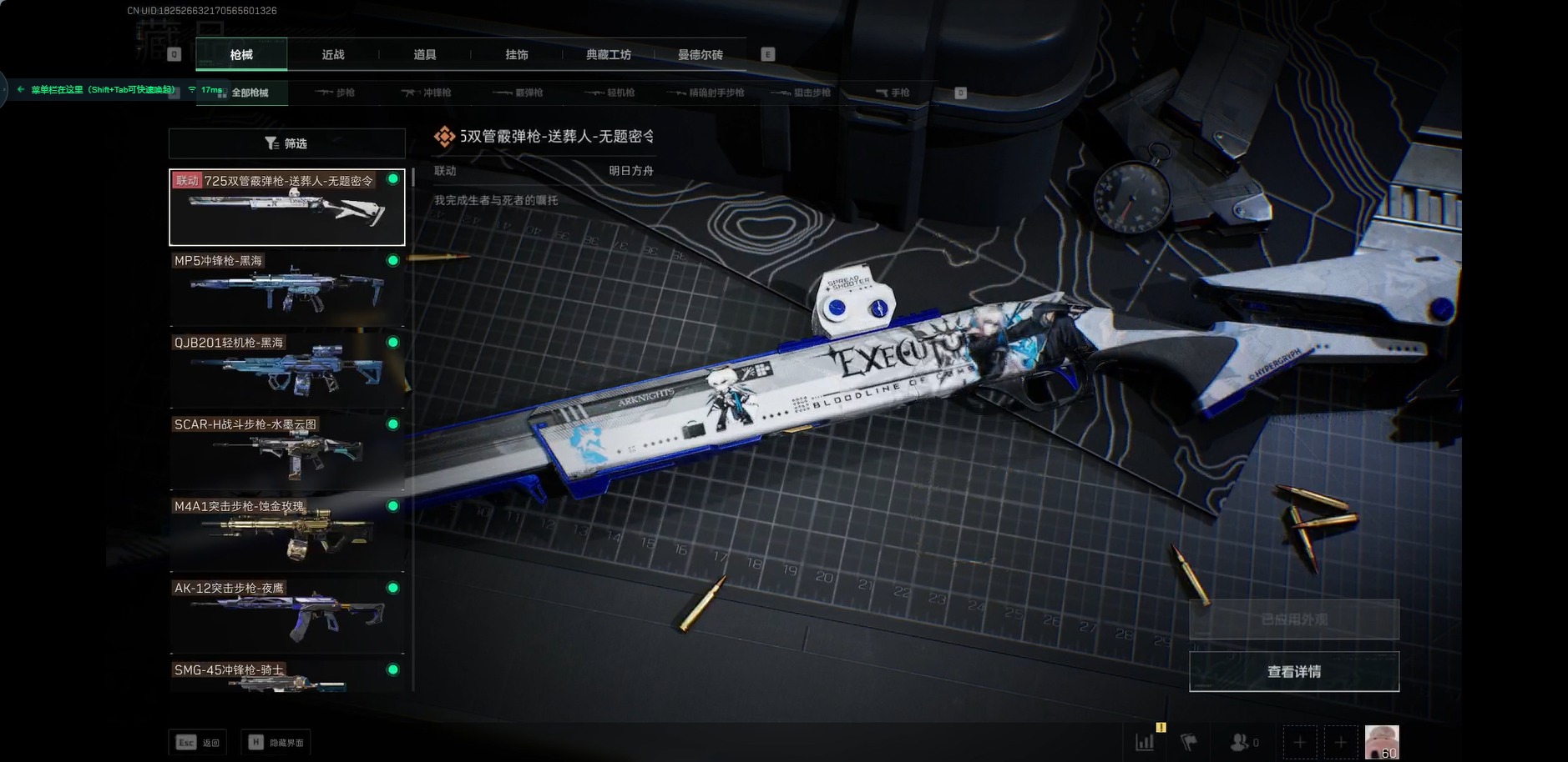 - [11523966]总资产:186.9 1干员外观 1近战传说 11传说枪械 高级安全箱(2×3)9.15号到期 可二次 可修改实名 烽火地带段位:钻石 全面战场段位:上等兵 哈夫币:2.384 传说武器皮肤:近战-北极星,SCAR-H战斗步枪-水墨云图,SR-25射手步枪-水墨云图,SCAR-H战斗步枪-铁艺苍穹,AK-12突击步枪-夜鹰,SMG45冲锋枪-骑士,复合弓-黑-天际线,CAR-15突击步枪-阿米娅,725双管霰弹枪-送葬人-无题密令,QCQ171冲锋枪-北极星,K437突击步枪-北极星 史诗武器皮肤:QBZ95-1突击步枪-ACE,M4A1突击步枪-特勤执行,AUG突击步枪-特勤执行,Vector冲锋枪-红色彗星,PTR-32战斗步枪-ACE,AUG突击步枪-蝮蛇,M700狙击步枪-蝮蛇,PKM通用机枪-蝮蛇,G3战斗步枪-战场英杰,SR-25射手步枪-尖端治疗,PKM通用机枪-荒野求生,AS Val突击步枪-尖端治疗,M700狙击步枪-守夜人,SG552突击步枪-尖端治疗,Ash-12战斗步枪-守夜人,MP5冲锋枪-深海恐惧,SR-3M紧凑突击步枪-荒野求生,勇士冲锋枪-深海恐惧,SG552突击步枪-深海恐惧,AKM突击步枪-林中猎手,.357左轮-幸运时刻,M16A4突击步枪-竞赛选手,PKM通用机枪-守夜人,M1014霰弹枪-林中猎手,SV-98狙击步枪-林中猎手,PSG-1射手步枪-无垢,SV-98狙击步枪-囚徒,QBZ95-1突击步枪-曙光,沙漠之鹰-曙光,K416突击步枪-竞技风,Vector冲锋枪-阿萨拉文明,SVD狙击步枪-阿萨拉工艺,S12K霰弹枪-曙光,AS Val突击步枪-刀锋,PKM通用机枪-英雄,M700狙击步枪-竞技风,QSZ92G-风林火山,AUG突击步枪-战术迷彩 干员外观:露娜-黑·天际线
