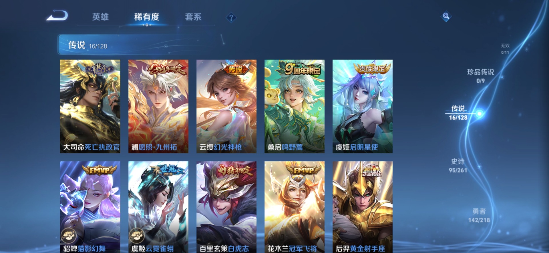 - PX_2057222-贵族等级: V7 英雄数: 124 皮肤数: 252 星传说: 零号·雷霆 传说皮: 黄金射手座,绛天战甲,久胜战神,炽阳神光,一念神魔,零号·赤焰,淬星耀世,超时空战士-狄仁杰,澜逐花归海,乘龙·铭钟鼎,乘龙·淬吴钩,牧神诗旅,云诺千山 限定皮: 遇见飞天,李小龙,梁祝,岱宗,神威,青龙志,高山流水,五谷丰年,山海·玄木吟,鸣野蒿