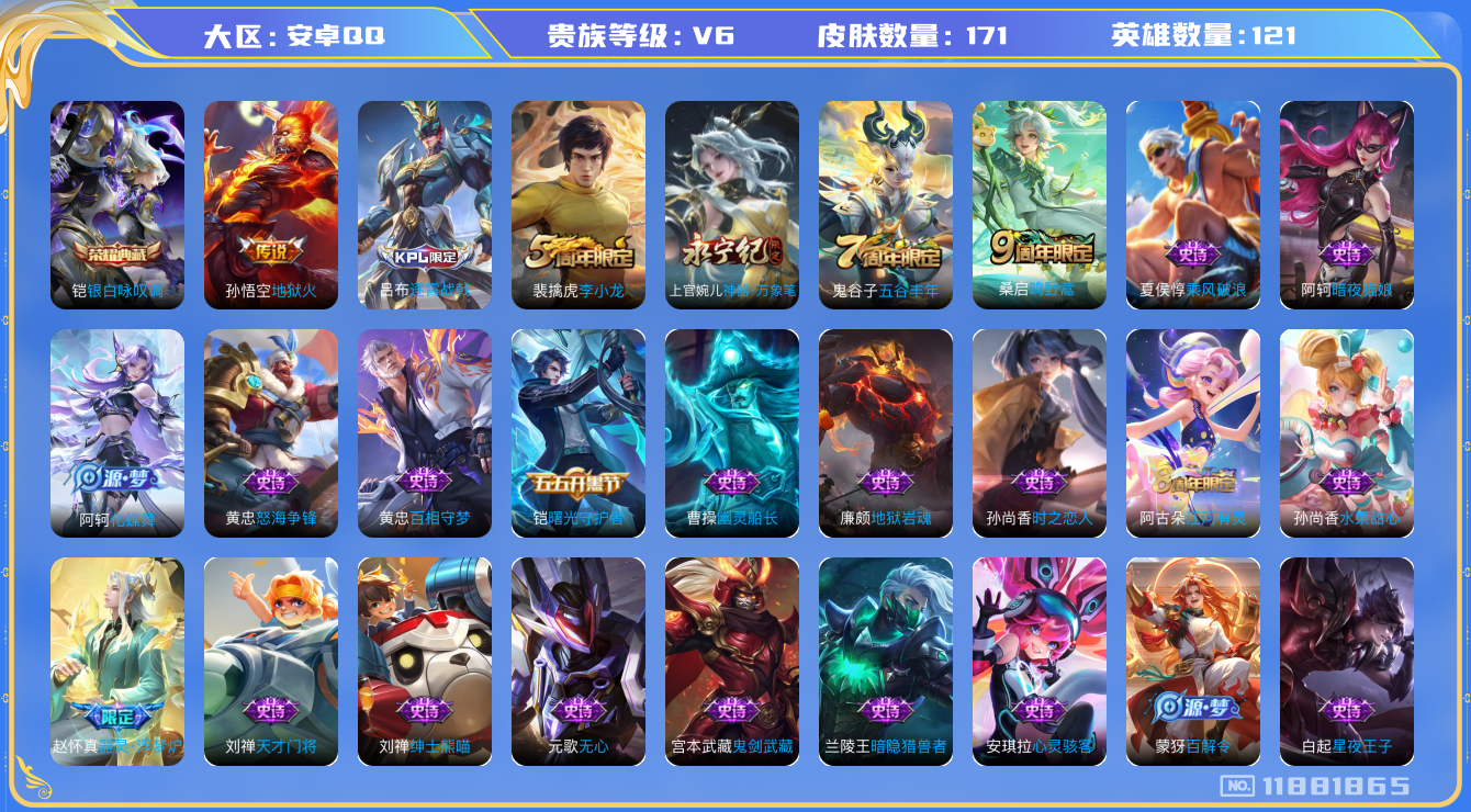 [11881865]V6 1典藏 2传说 121英雄 171皮肤 可修改实名 优质装备:银白咏叹调(倪克斯侍卫),地狱火 珍宝阁皮:妄想食味 限定皮:逐霄战戟,鸣野蒿,五谷丰年,李小龙,神器·万象笔 史诗皮:器灵·浮梦炉,化蝶舞,怒海争锋,百相守梦-黄忠,江河有灵,百解令(蒙犽),暗夜猫娘,冰冠公主,时之恋人-孙尚香,女仆咖啡,水果甜心,绅士熊喵,天才门将,星夜王子,心灵骇客,暗隐猎兽者,幽灵船长,鬼剑武藏,地狱岩魂,纤云弄巧,繁星吟游(呼啦呼啦),乘风破浪,逐浪之夏,曙光守护者,金属风暴,鹰眼统帅,魅力维加斯,赏金猎手,无心,未来纪元-赵云