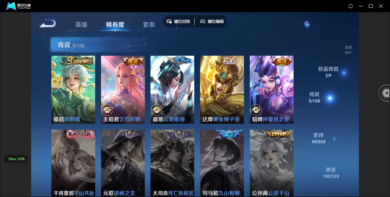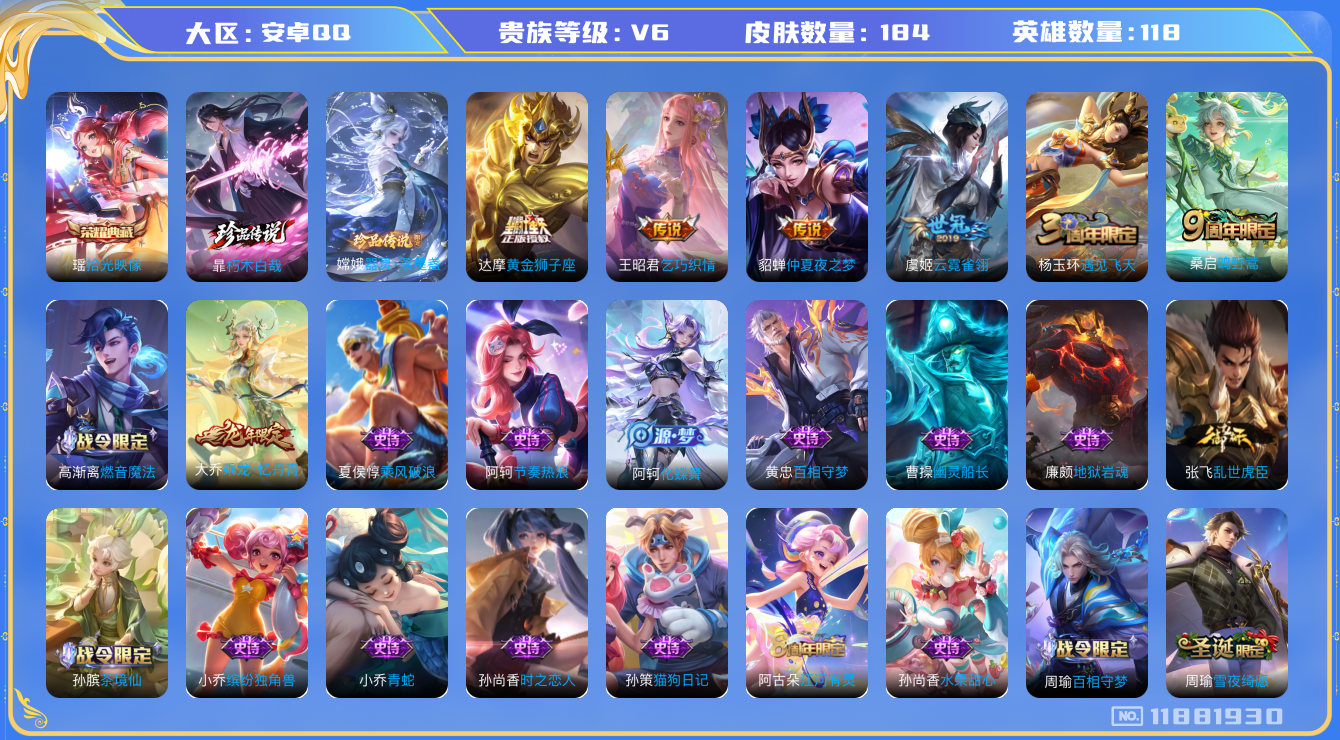- [11864142]V7 14传说 124英雄 183皮肤 可修改实名 女号 优质装备:黄金狮子座,炽阳神光,一念神魔,仲夏夜之梦(大飞蛾),音你心动-周瑜,时之恋人-刘备(电焊工),浮生妄,鹤羽星尊,澜逐花归海 传说皮:乘龙·铭钟鼎(赵云年限),落雪白狼 珍宝阁皮:妄想食味 限定皮:逐霄战戟,鸣野蒿,怒海麟威,青龙志(铠年限),武圣,御风骁将(吕布年限),李小龙 史诗皮:龙之律动,百相守梦-周瑜,怒海争锋,破空之剑,蔬乡物语(鲁班七号),超元猎域,百相守梦-百里守约,苍穹之光,冰冠公主,青蛇,偶像歌手,晚萤,百相守梦(刘备),龙骑士(小龙虾),乱世虎臣,节奏热浪,水果甜心,天才门将,星夜王子,心灵骇客,功夫厨神,幽灵船长,鬼剑武藏,暗渊魔法,心灵战警,地狱岩魂,纤云弄巧,缤纷独角兽,逐浪之夏,水晶猎龙者,箭羽风息,金属风暴,圣诞恋歌,鹰眼统帅,魅力维加斯,奇遇舞章