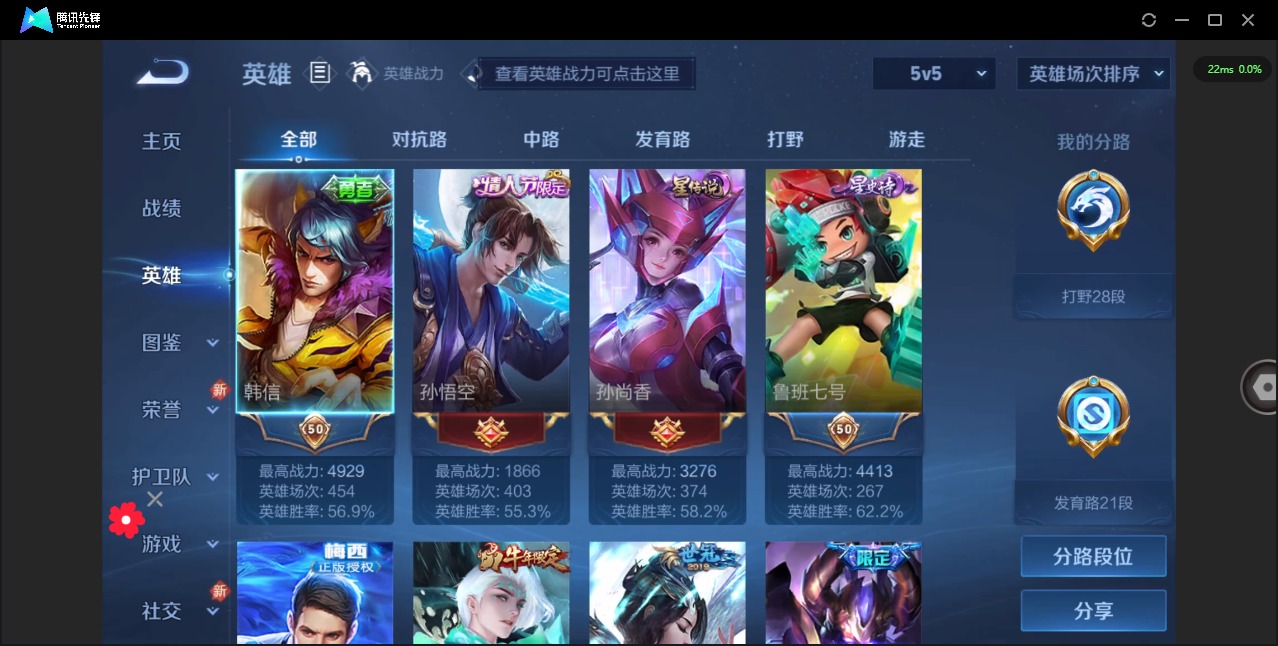 - [12295997]V7 1典藏 6传说 125英雄 285皮肤 可修改实名 优质装备:弑枪猎影(韩信典藏),黄金狮子座 传说皮:幻光神枪 珍宝阁皮:胡桃夹子,女武神,玩趣恶龙 限定皮:鸣野蒿,至尊宝,白虎志(电光耗子),时雨天司(水龙头),神威(电光马子),遇见飞天,高山流水,五谷丰年,游园惊梦,梁祝,李小龙,霸王别姬-虞姬,圣诞老人,默契交锋-花木兰,孙行者,大圣娶亲,蜜橘之夏,匿光追影者,寅虎·赤拳(老虎年限),天降福星 史诗皮:星界战将,石田雨龙,百相守梦-黄忠,紫霞仙子,苍穹之光,电玩小子(小书包),特工魅影,千年之狐,江河有灵,百解令(蒙犽),高渐离燃音魔法,蒙恬荣光圣徽,冰冠公主,偶像歌手,电玩·爆裂旋风,龙骑士(小龙虾),末日机甲-吕布,猫狗日记-孙策,猫狗日记-大乔,乱世虎臣,节奏热浪,修罗,女仆咖啡,摇滚巨星,水果甜心,绅士熊喵,天才门将,星夜王子,心灵骇客,功夫厨神,德古拉伯爵,暗隐猎兽者,幽灵船长,鬼剑武藏,心灵战警,舞动绿茵,地狱岩魂,纤云弄巧,繁星吟游(呼啦呼啦),拒霜思,缤纷独角兽,乘风破浪,逐浪之夏,月团寄思,水晶猎龙者,曙光守护者,金属风暴,原初追逐者,圣诞狂欢,圣诞恋歌,鹰眼统帅,王者之锤,暗夜贵公子,魅力维加斯,黎明之约,无心