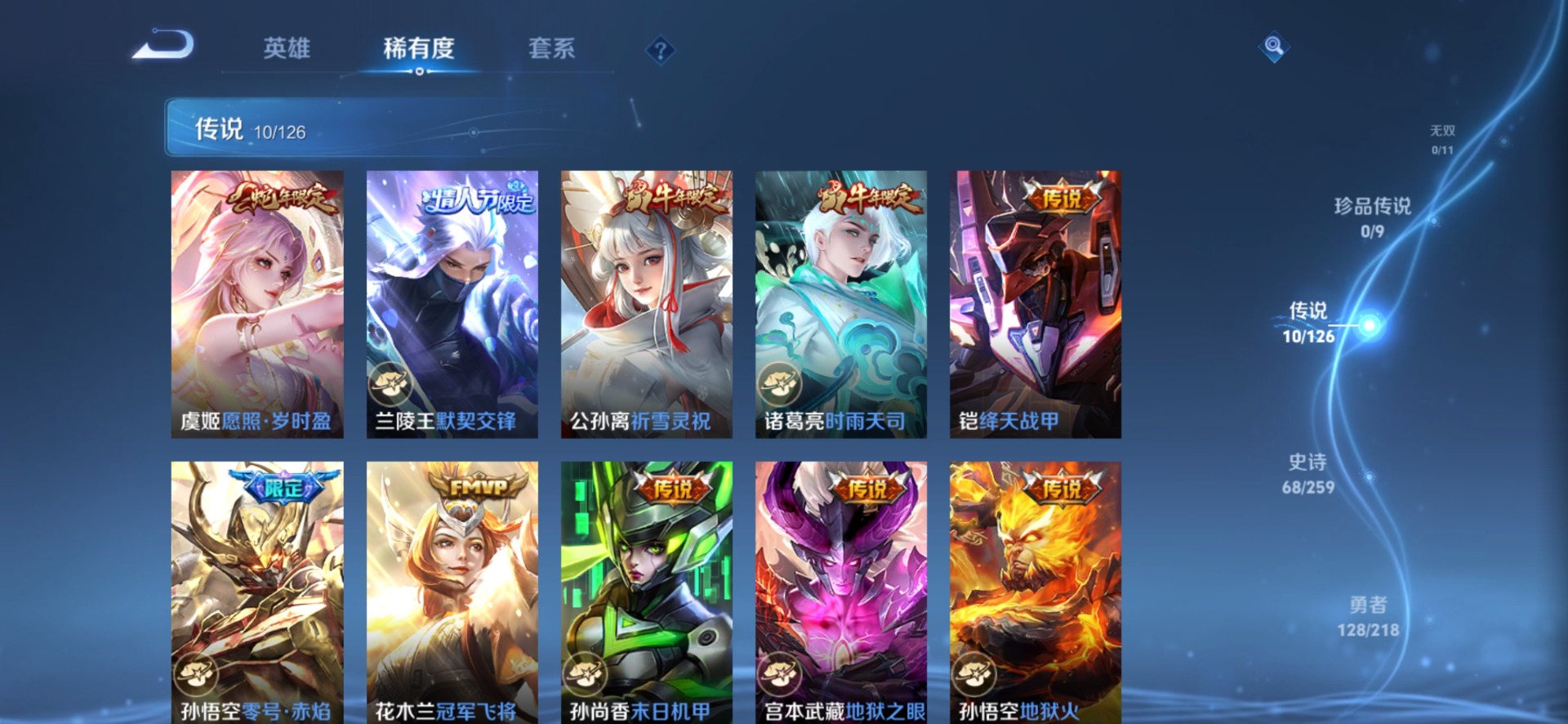 - PX_2066399-79 安卓QQ/至尊星耀/262皮肤/125英雄/1典藏/0珍品无双/0无双/1珍品传说/15传说/75史诗/9稀有英雄 【1 珍品传说】怪盗基德 马可波罗, 【1 典藏皮肤】弑枪猎影 韩信, 【15 传说皮肤】枫霜尽 橘右京,电玩·雷克斯 澜,无双飞将 马超,李逍遥 曜,深海之息 马可波罗,诗剑行 李白,燃星之曲 花木兰,地狱之眼 宫本武藏,时雨天司 诸葛亮,无尽星芒 后