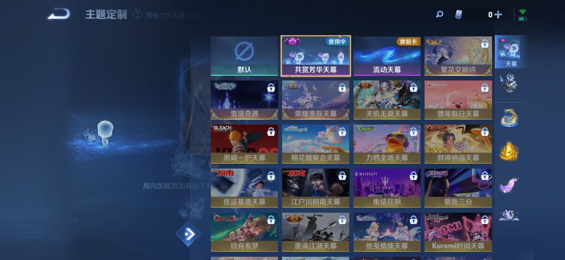 刘邦德古拉伯爵,夏侯惇乘风破浪,阿轲暗夜猫娘,铠曙光守护者,曹操幽灵船长,廉颇地狱岩魂,小乔缤纷独角兽,孙策猫狗日记,赵怀真器灵·浮梦炉,鲁班七号电玩小子,吕布圣诞狂欢,吕布末日机甲,露娜紫霞仙子,诸葛亮黄金分割率,刘禅天才门将,刘禅绅士熊喵,宫本武藏鬼剑武藏,兰陵王暗隐猎兽者,花木兰水晶猎龙者,李白千年之狐,安琪拉心灵骇客,蒙犽百解令,白起星夜王子,嬴政摇滚巨星,嬴政暗夜贵公子,程咬金功夫厨神,百里守约特工魅影,李元芳逐浪之夏,墨子金属风暴,蔡文姬舞动绿茵,王昭君偶像歌手,嫦娥拒霜思