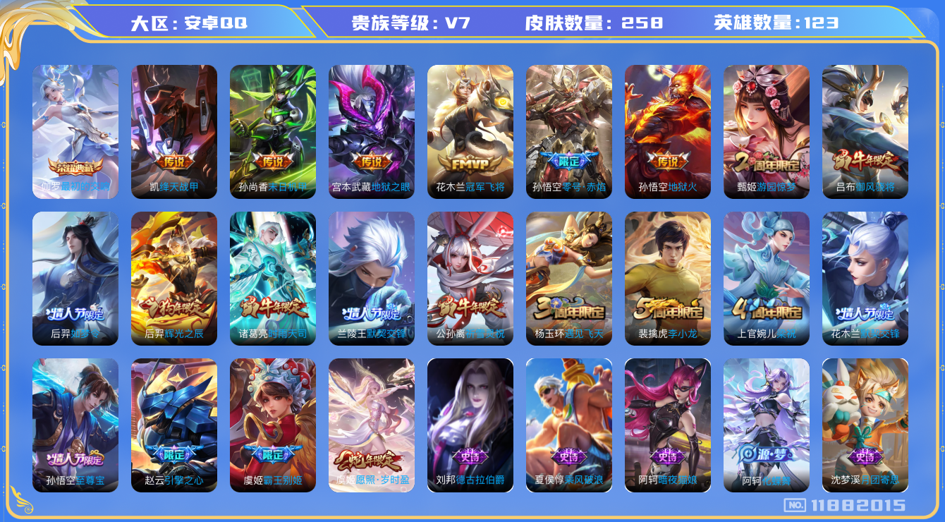 [11882015]V7 1典藏 10传说 123英雄 258皮肤 可修改实名 优质装备:最初的交响(伽罗典藏),冠军飞将,绛天战甲(鸡嘴战神),末日机甲-孙尚香(绿蚂蚱),地狱火,零号·赤焰,地狱之眼 珍宝阁皮:妄想食味,女武神 限定皮:愿照·岁时盈(虞姬年限),至尊宝,时雨天司(水龙头),遇见飞天,游园惊梦,梁祝,御风骁将(吕布年限),祈雪灵祝(雪兔子),李小龙,辉光之辰,如梦令-后羿,霸王别姬-虞姬,默契交锋-兰陵王,默契交锋-花木兰,引擎之心 史诗皮:器灵·浮梦炉,化蝶舞,紫霞仙子,电玩小子(小书包),黄金分割率,特工魅影,千年之狐,江河有灵,百解令(蒙犽),偶像歌手,暗夜猫娘,末日机甲-吕布,猫狗日记-孙策,乱世虎臣,女仆咖啡,摇滚巨星,水果甜心,绅士熊喵,天才门将,星夜王子,心灵骇客,功夫厨神,德古拉伯爵,暗隐猎兽者,幽灵船长,鬼剑武藏,舞动绿茵,地狱岩魂,纤云弄巧,繁星吟游(呼啦呼啦),拒霜思,缤纷独角兽,乘风破浪,逐浪之夏,月团寄思,水晶猎龙者,曙光守护者,金属风暴,圣诞狂欢,鹰眼统帅,暗夜贵公子,魅力维加斯