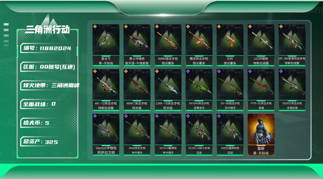 [11882024]总资产:325.4M 1干员外观 10传说枪械 哈夫币:5.687K 顶级安全箱(3×3)9.15号到期 可二次 可修改实名 优质装备:顶级安全箱(3x3) 烽火地带段位:三角洲巅峰 全面战场段位:列兵 传说武器皮肤:M4A1突击步枪-阿米娅,CAR-15突击步枪-阿米娅,复合弓-黑-天际线,AWM狙击步枪-捞点薯条,腾龙突击步枪-捞点薯条,93R-捞点薯条,AK-12突击步枪-特斯拉线圈,SR-3M紧凑突击步枪-特斯拉线圈,UZI冲锋枪-特斯拉线圈,勇士冲锋枪-能天使-午夜邮差 史诗武器皮肤:M16A4突击步枪-竞赛选手,SG552突击步枪-深海恐惧,AKM突击步枪-林中猎手,M1014霰弹枪-林中猎手,SV-98狙击步枪-林中猎手,PTR-32突击步枪-英雄,M250通用机枪-囚徒,SCAR-H战斗步枪-囚徒,Vector冲锋枪-阿萨拉文明 干员外观:露娜-黑·天际线