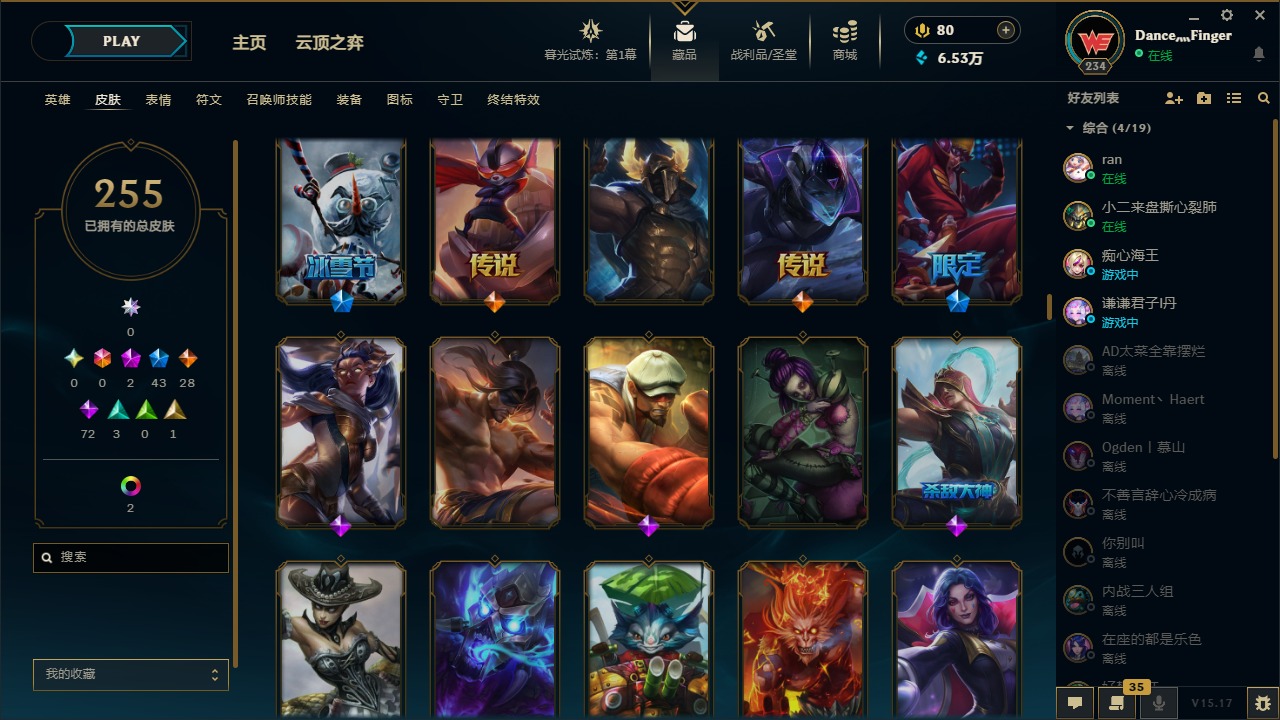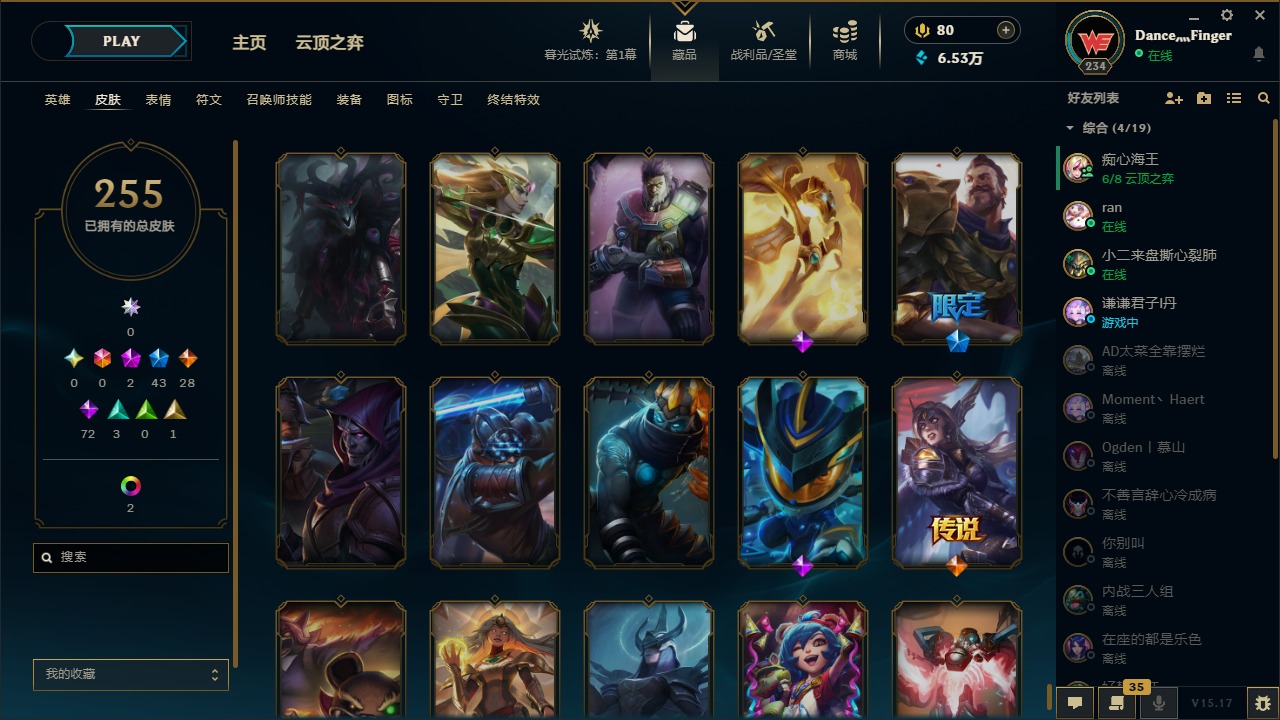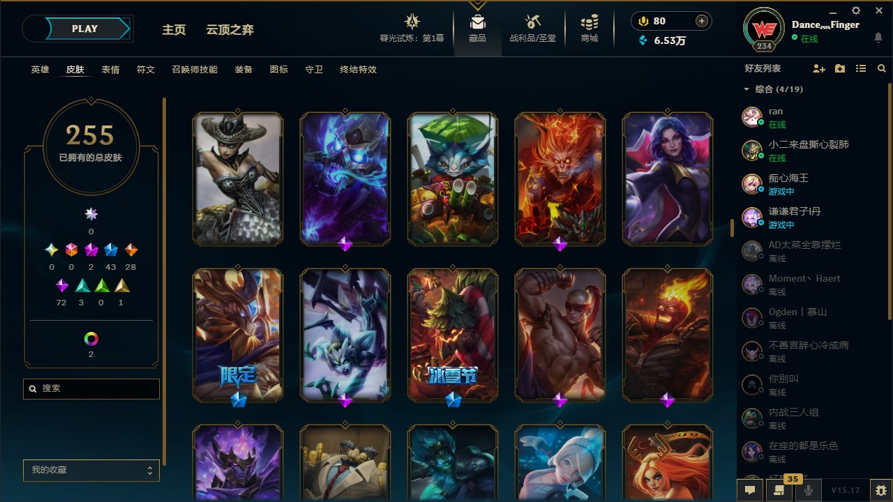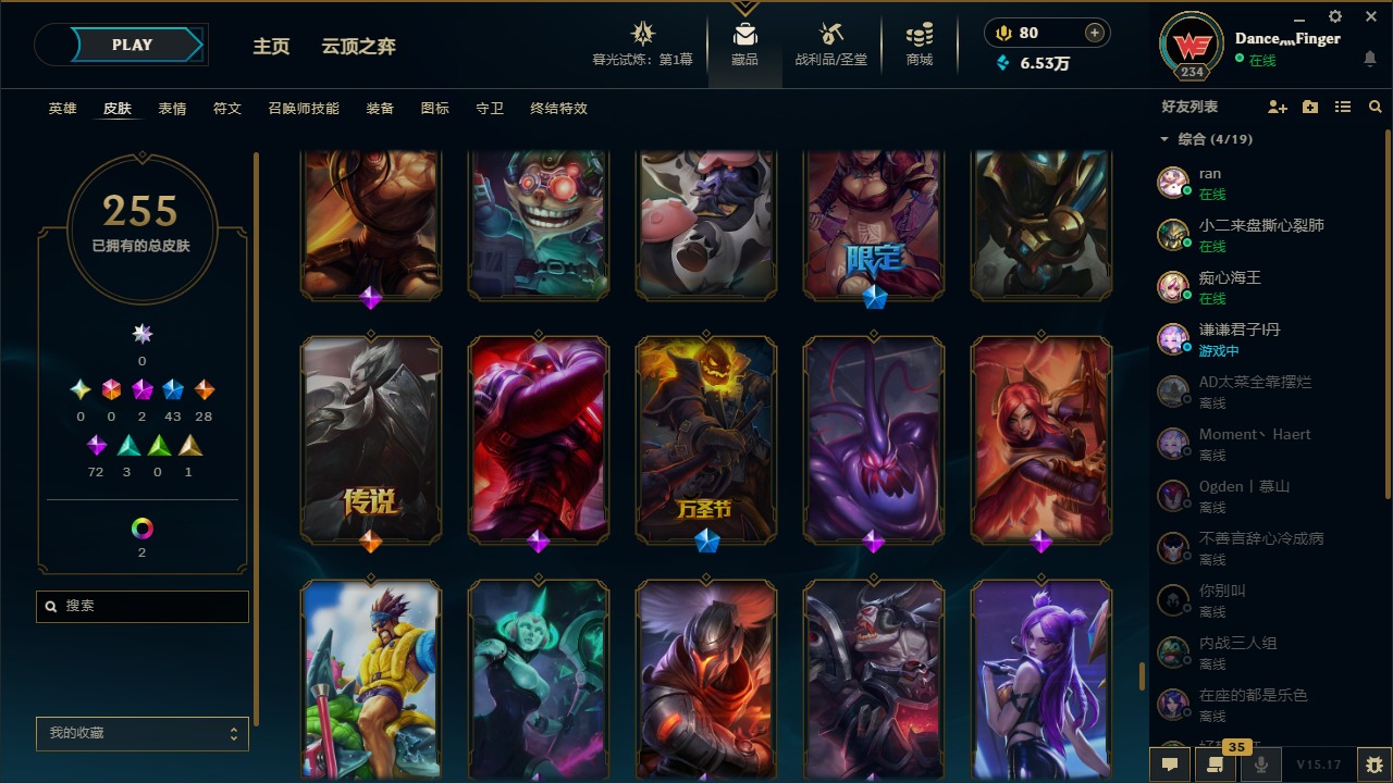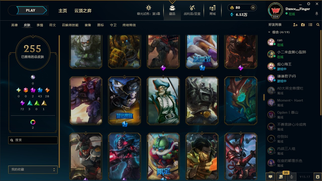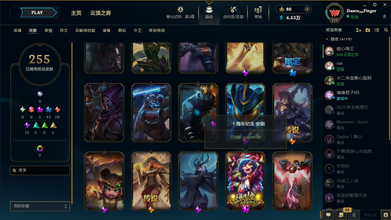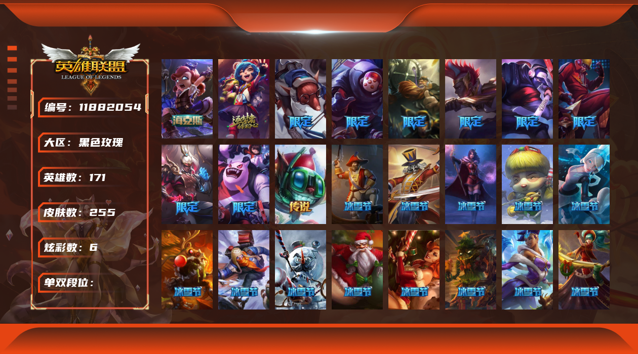 [11882054]2神话 43限定 28传说 72史诗 255皮肤 6炫彩 171英雄 可二次 可修改实名 优质装备:防爆天使 凯尔,暗影 沃里克,巧克力工坊 波比,都铎王朝 图奇,夺命美人 卡特,钢铁之翼 凤凰,冠军典狱长 锤石,冠军之箭 艾希,冠军之刃 锐雯,冠军之刃 锐雯 2016,警用试作体K-9 内瑟斯,蓝色忧郁 崔斯特,女猎手 希维尔,诺斯费拉图 弗拉基米尔,冠军之刃 锐雯 2016 凯旋圣装,外星装甲 库奇,净雪之月 莫甘娜 冬虹,魔女 阿卡丽 虚荣 海克斯:海克斯 安妮 赛季限定皮:胜利女神 希维尔,胜利之树 茂凯,胜利枪神 格雷福斯 冠军限定系列:S13 T1 李青,S1FNC 酒桶,S2 暗杀星 努努,S2 暗杀星 慎,S3 SKT T1 贾克斯,S3 SKT T1 李青,S4 SSW 图奇,S6 SKT T1 艾克 冰雪节限定:冰雪节 炼金,冬季仙境 发条,冬季仙境 卡尔玛,胡桃夹子 小丑,平安夜女神 娑娜,圣诞开心鬼 提莫,圣诞老人 酒桶,圣诞糖果棒 厄运小姐,圣诞驯鹿 克格莫,冰雪节 茂凯,幸福女神 乐芙兰,雪默丁格,英勇玩具兵船长 泳池派对:泳池派对 吉格斯 万圣节限定:鬼影森森 茂凯,鬼影重重 魔腾,魅惑女巫 奈德丽,南瓜头 费德提克,无头骑士 人马 周年:10周年 安妮