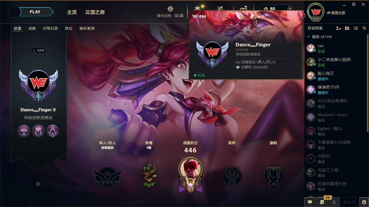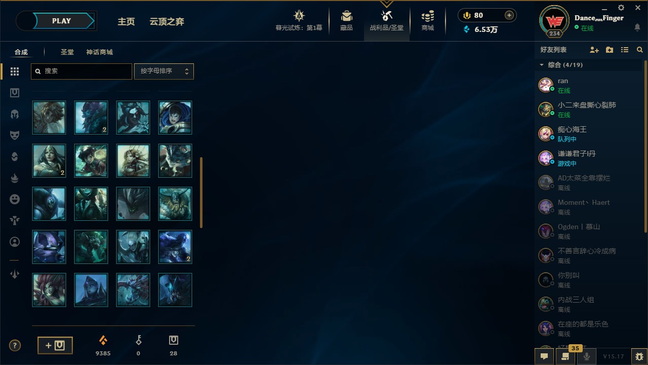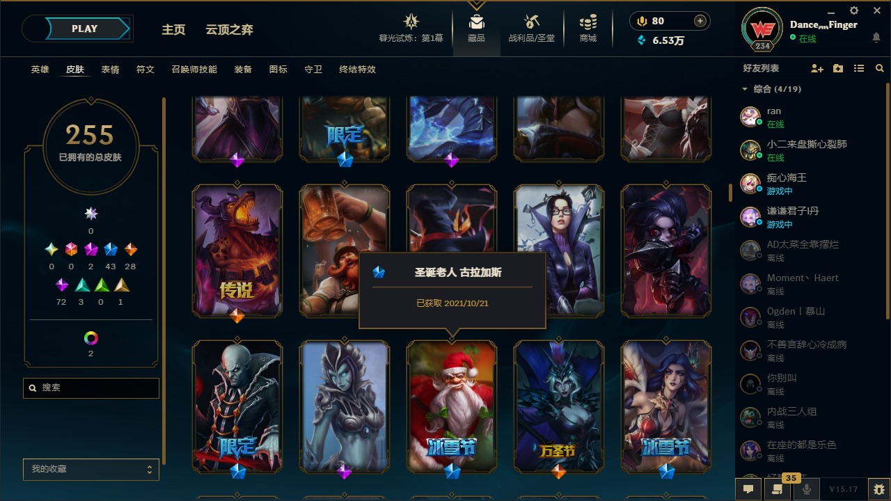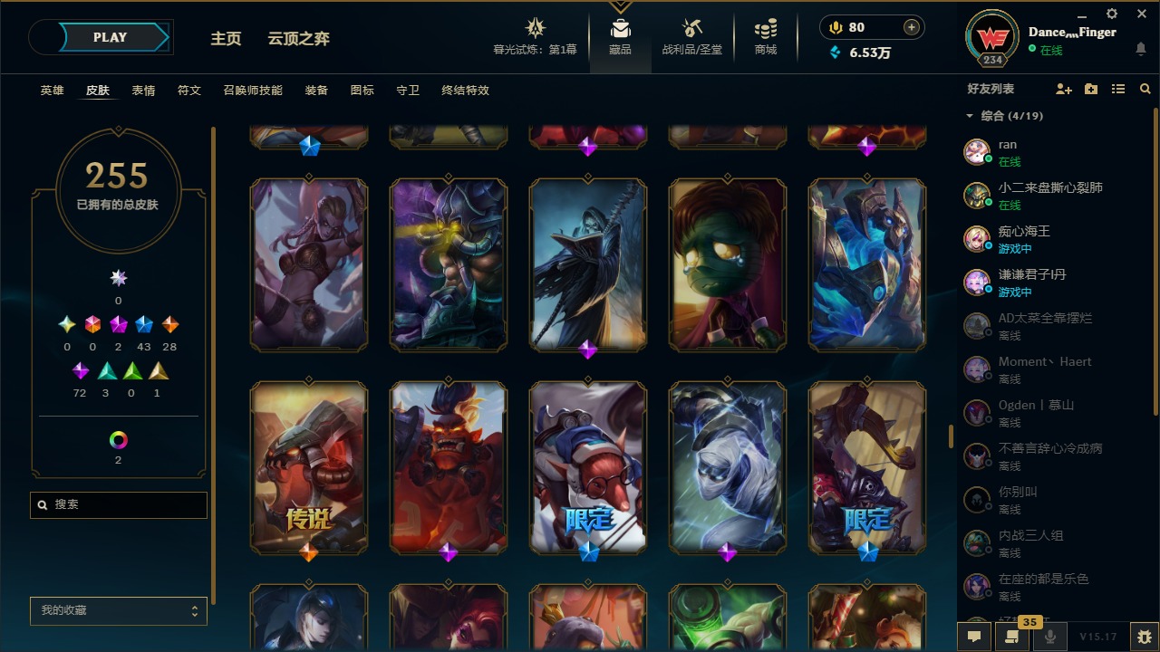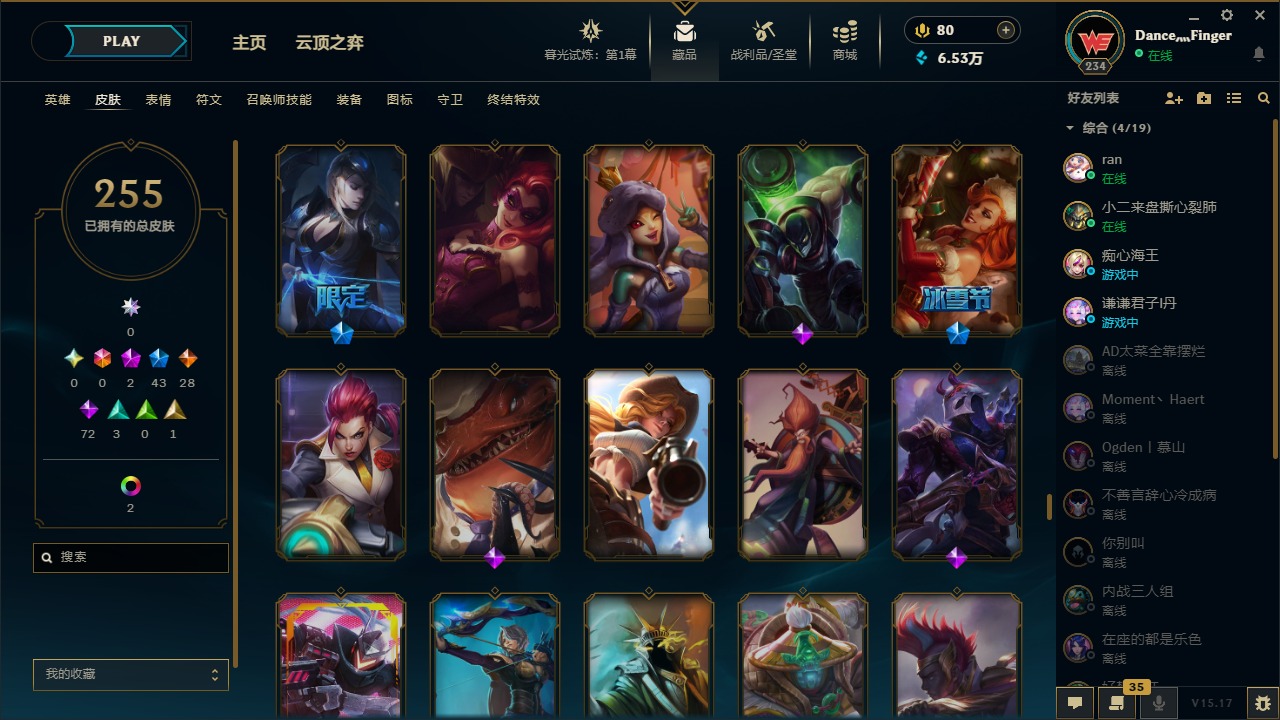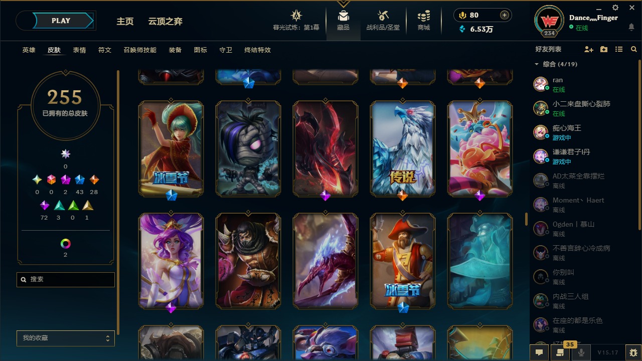 [11882054]2神话 43限定 28传说 72史诗 255皮肤 6炫彩 171英雄 可二次 可修改实名 优质装备:防爆天使 凯尔,暗影 沃里克,巧克力工坊 波比,都铎王朝 图奇,夺命美人 卡特,钢铁之翼 凤凰,冠军典狱长 锤石,冠军之箭 艾希,冠军之刃 锐雯,冠军之刃 锐雯 2016,警用试作体K-9 内瑟斯,蓝色忧郁 崔斯特,女猎手 希维尔,诺斯费拉图 弗拉基米尔,冠军之刃 锐雯 2016 凯旋圣装,外星装甲 库奇,净雪之月 莫甘娜 冬虹,魔女 阿卡丽 虚荣 海克斯:海克斯 安妮 赛季限定皮:胜利女神 希维尔,胜利之树 茂凯,胜利枪神 格雷福斯 冠军限定系列:S13 T1 李青,S1FNC 酒桶,S2 暗杀星 努努,S2 暗杀星 慎,S3 SKT T1 贾克斯,S3 SKT T1 李青,S4 SSW 图奇,S6 SKT T1 艾克 冰雪节限定:冰雪节 炼金,冬季仙境 发条,冬季仙境 卡尔玛,胡桃夹子 小丑,平安夜女神 娑娜,圣诞开心鬼 提莫,圣诞老人 酒桶,圣诞糖果棒 厄运小姐,圣诞驯鹿 克格莫,冰雪节 茂凯,幸福女神 乐芙兰,雪默丁格,英勇玩具兵船长 泳池派对:泳池派对 吉格斯 万圣节限定:鬼影森森 茂凯,鬼影重重 魔腾,魅惑女巫 奈德丽,南瓜头 费德提克,无头骑士 人马 周年:10周年 安妮