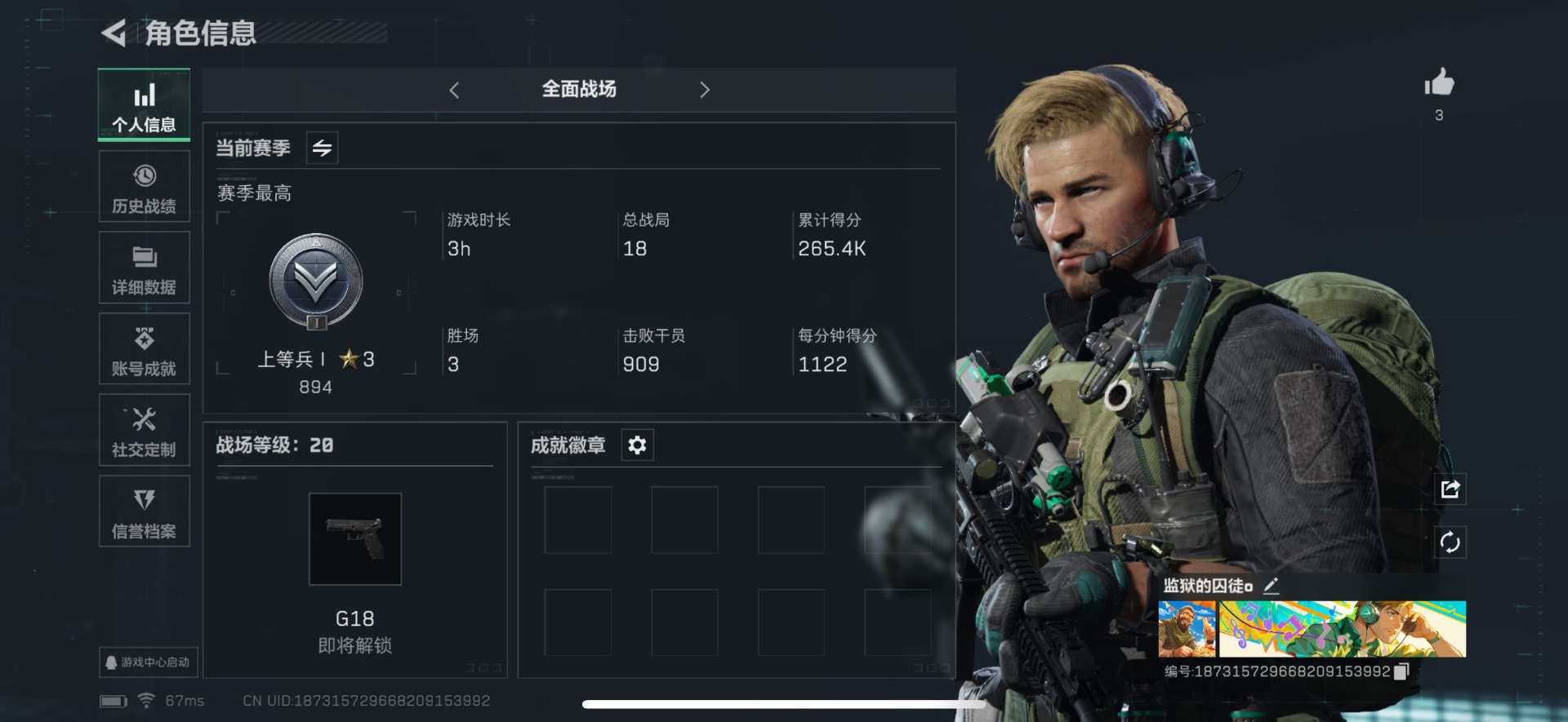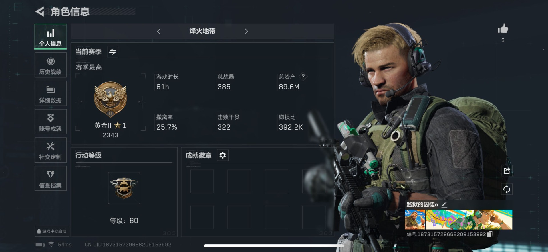 - [11658002]总资产:118.5M 1干员外观 1近战传说 13传说枪械 哈夫币:3.615K 高级安全箱(9.16到期) 可二次 可修改实名 优质装备:近战-北极星 烽火地带段位:黑鹰 全面战场段位:无段位 传说武器皮肤:UZI冲锋枪-特斯拉线圈,AWM狙击步枪-捞点薯条,腾龙突击步枪-捞点薯条,93R-捞点薯条,AK-12突击步枪-特斯拉线圈,SR-3M紧凑突击步枪-特斯拉线圈,复合弓-黑-天际线,K437突击步枪-北极星,QCQ171冲锋枪-北极星,725双管霰弹枪-送葬人-无题密令,M4A1突击步枪-阿米娅,CAR-15突击步枪-阿米娅 史诗武器皮肤:QJB201轻机枪-Old Habits,MP5冲锋枪-深海恐惧,M16A4突击步枪-竞赛选手,SV-98狙击步枪-林中猎手,SCAR-H战斗步枪-囚徒,腾龙突击步枪-无垢,MP7冲锋枪-无垢,PSG-1射手步枪-无垢,SVD狙击步枪-荒野求生,SR-3M紧凑突击步枪-荒野求生,PKM通用机枪-荒野求生,S12K霰弹枪-曙光 干员外观:蜂医-送葬人·无题密令(S5)