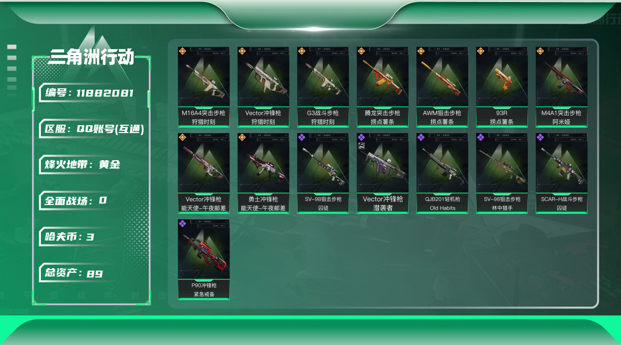 [11882081]总资产:89.6M 9传说枪械 哈夫币:3.876K 进阶安全箱(9.16到期) 可二次 可修改实名 烽火地带段位:黄金 全面战场段位:上等兵 传说武器皮肤:M16A4突击步枪-狩猎时刻,AWM狙击步枪-捞点薯条,腾龙突击步枪-捞点薯条,93R-捞点薯条,勇士冲锋枪-能天使-午夜邮差,Vector冲锋枪-狩猎时刻,Vector冲锋枪-能天使-午夜邮差,G3战斗步枪-狩猎时刻,M4A1突击步枪-阿米娅 史诗武器皮肤:Vector冲锋枪-潜袭者,QJB201轻机枪-Old Habits,SV-98狙击步枪-林中猎手,SV-98狙击步枪-囚徒,SCAR-H战斗步枪-囚徒,P90冲锋枪-紧急戒备