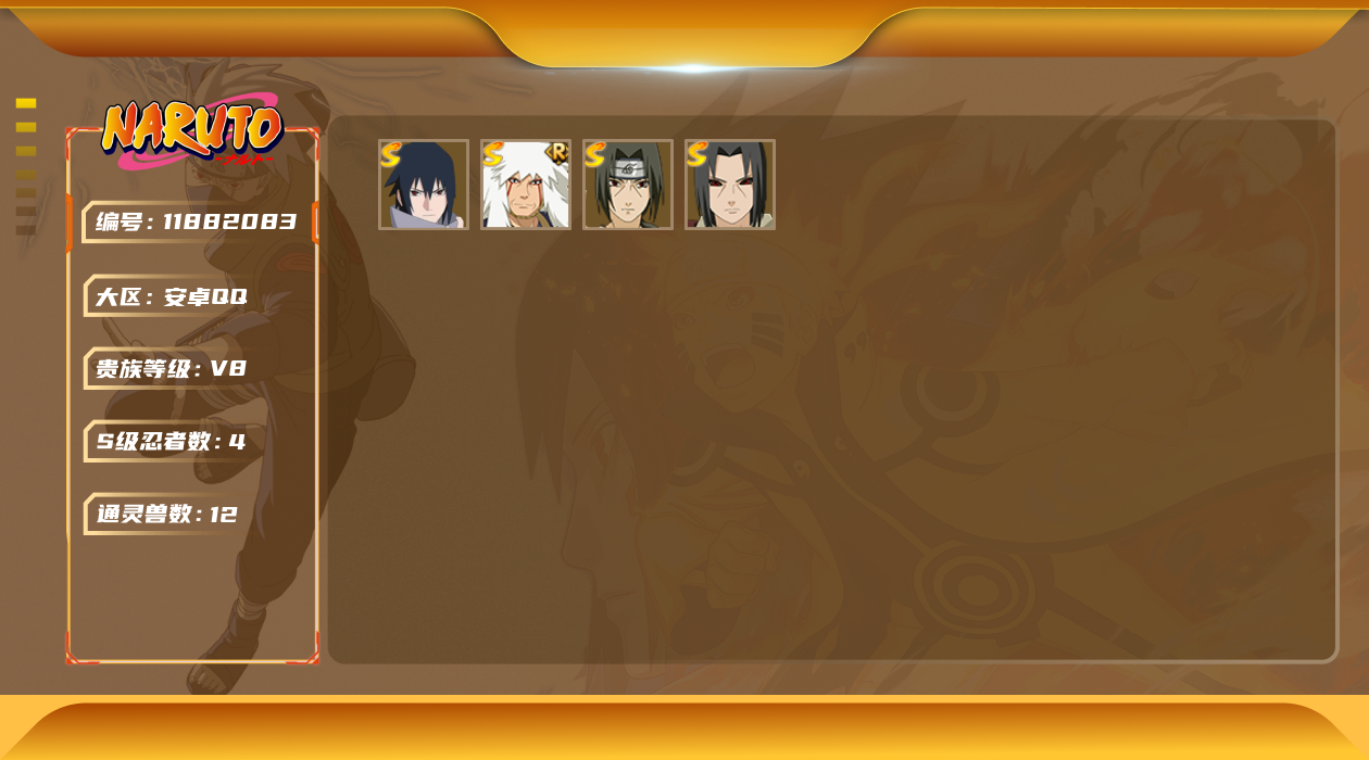 [11882083]V8 4S忍 14A忍 12通灵 355.1W战力 可二次 可修改实名 优质装备:宇智波鼬「秽土转生」,宇智波佐助「永恒万花筒」 S级忍者:自来也 「舞之豪杰」,宇智波鼬 「须佐能乎」