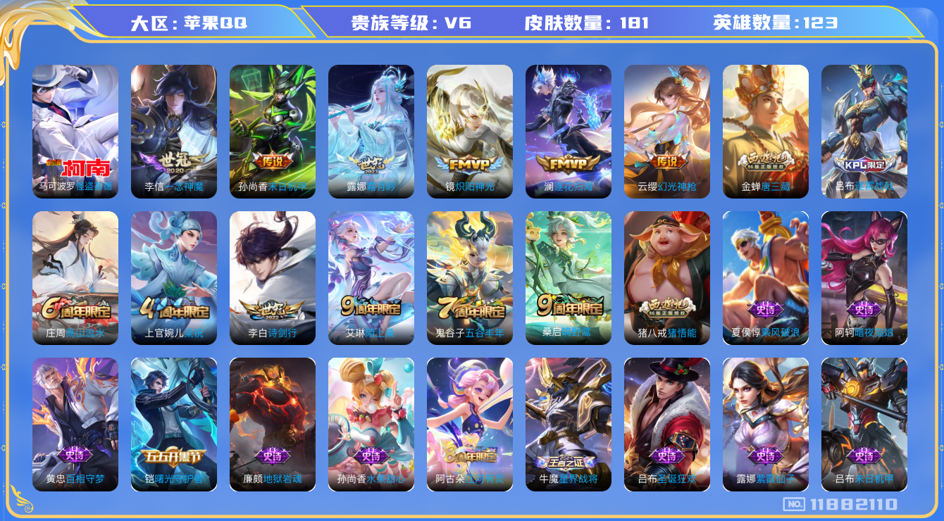 - [12288582]V6 1珍品传说 9传说 111英雄 104皮肤 可修改实名 优质装备:怪盗基德,云霓雀翎,记忆之芯(机甲兔) 珍宝阁皮:女武神 限定皮:鸣野蒿,太华(伽罗年限),异界灵契(白毛香),无限倾心-虞姬,祈雪灵祝(雪兔子),朱雀志(守约年限),如梦令-后羿,无尽星芒,深海之息(深海大菠萝),山海·玄木吟(马可年限) 史诗皮:石田雨龙,百相守梦-百里守约,特工魅影,百解令(蒙犽),无限星赏官,冰冠公主,偶像歌手,时之恋人-孙尚香,水果甜心,逐浪之夏,鹰眼统帅,黎明之约,奇遇舞章