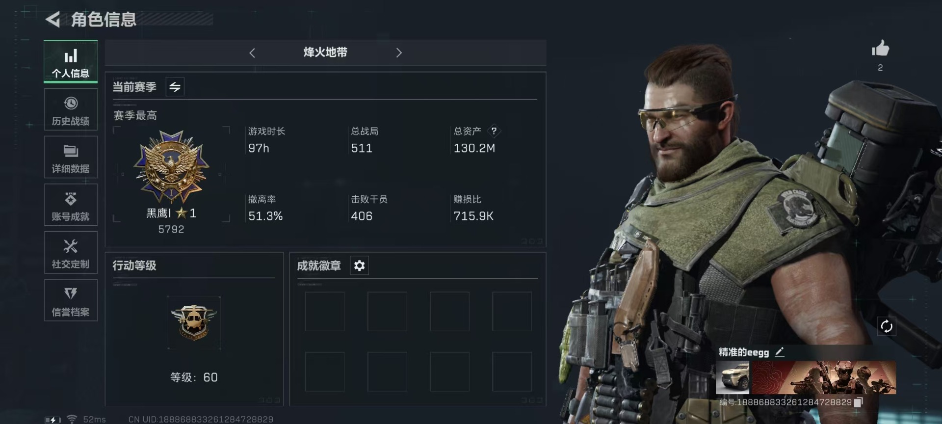 - [11682149]总资产:104.7M 哈夫币:27.966K 可二次 可修改实名 烽火地带段位:无段位 全面战场段位:无段位