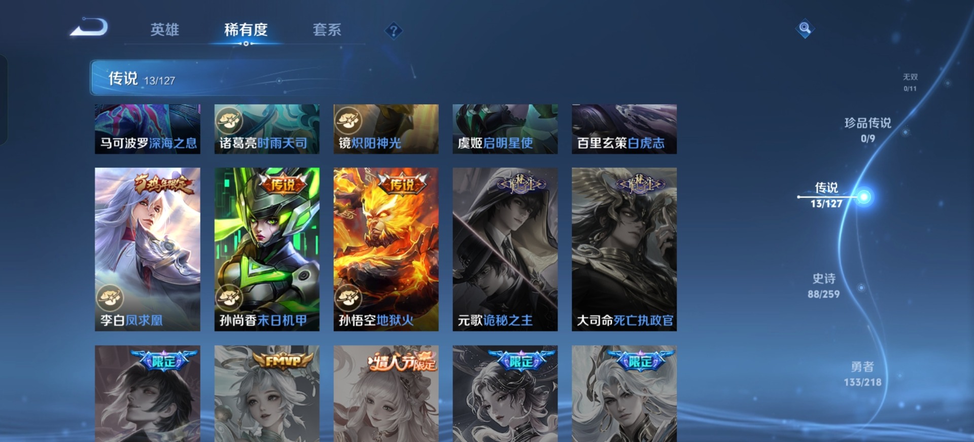 伽罗天狼溯光者,干将莫邪冰霜恋舞曲,吕布御风骁将,露娜一生所爱,诸葛亮时雨天司,貂蝉逐梦之音,裴擒虎李小龙,上官婉儿梁祝,花木兰默契交锋,花木兰青春决赛季,马可波罗逐梦之星,马可波罗山海·玄木吟,马可波罗深海之息,桑启鸣野蒿,孙悟空大圣娶亲,孙悟空至尊宝,百里玄策白虎志,马超神威,韩信飞衡,韩信逐梦之影,关羽冰锋战神