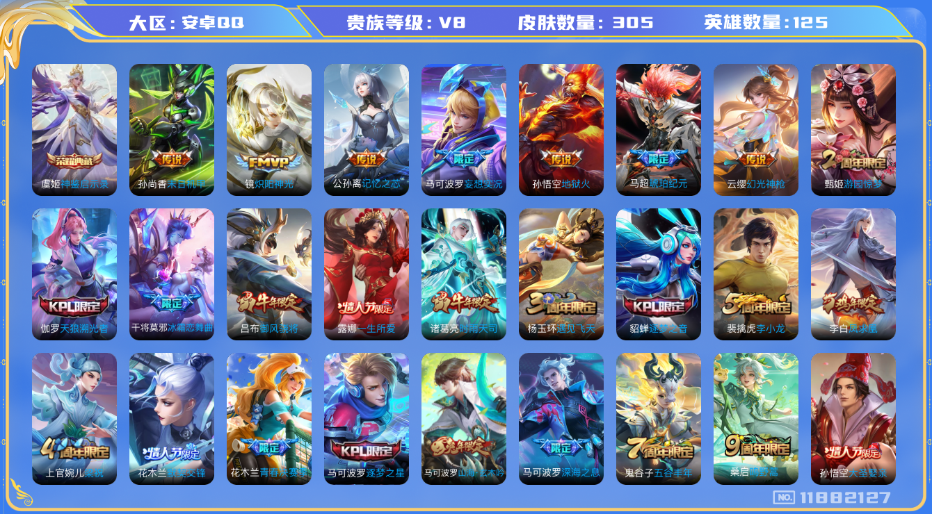[11882127]V8 1典藏 13传说 125英雄 305皮肤 可修改实名 优质装备:神鉴启示录,炽阳神光,末日机甲-孙尚香(绿蚂蚱),地狱火,记忆之芯(机甲兔),妄想实况,琥珀纪元马超 传说皮:幻光神枪 珍宝阁皮:优雅恋人,蔷薇恋人,女武神 限定皮:鸣野蒿,至尊宝,白虎志(电光耗子),凤求凰(白切鸡),时雨天司(水龙头),神威(电光马子),飞衡(韩信年限),遇见飞天,五谷丰年,冰锋战神,游园惊梦,梁祝,御风骁将(吕布年限),逐梦之星,天狼溯光者,逐梦之音,李小龙,逐梦之影,默契交锋-花木兰,一生所爱,大圣娶亲,青春决赛季,冰霜恋舞曲,深海之息(深海大菠萝),山海·玄木吟(马可年限) 史诗皮:化蝶舞,星界战将,石田雨龙,紫霞仙子,电玩小子(小书包),白龙吟,黄金分割率,特工魅影,千年之狐,末日机甲-莱西奥,江河有灵,百解令(蒙犽),蒙恬荣光圣徽,偶像歌手,龙骑士(小龙虾),魅语,无限星赏官,晚萤,末日机甲-吕布,猫狗日记-孙策,猫狗日记-大乔,乱世虎臣,节奏热浪,修罗,女仆咖啡,水果甜心,天才门将,星夜王子,功夫厨神,德古拉伯爵,暗隐猎兽者,幽灵船长,鬼剑武藏,天秀·启明,舞动绿茵,地狱岩魂,纤云弄巧,繁星吟游(呼啦呼啦),拒霜思,缤纷独角兽,乘风破浪,逐浪之夏,龙鼓争鸣,水晶猎龙者,曙光守护者,金属风暴,原初追逐者,圣诞狂欢,圣诞恋歌,鹰眼统帅,魅力维加斯,黎明之约,赏金猎手,无心