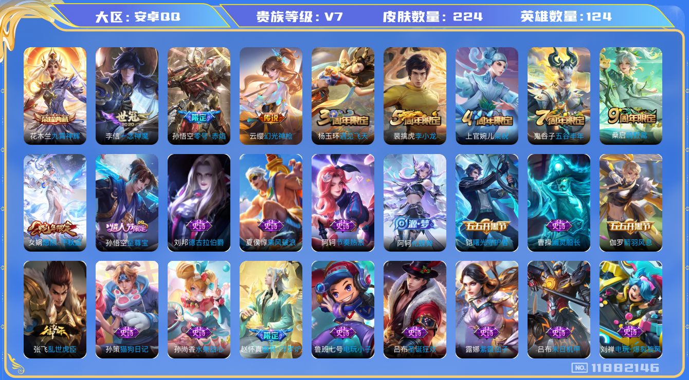 - [11446349]V10 4典藏 2无双 48传说 125英雄 414皮肤 可修改实名 优质装备:鸣剑·曳影,幻阙歌(貂蝉典藏),弑枪猎影(韩信典藏),青丘·九尾(妲己无双),碎月剑心(李白无双),神鉴启示录,黄金射手座,云鹰飞将(小将军),绛天战甲(鸡嘴战神),久胜战神,炽阳神光,一念神魔,云霓雀翎,末日机甲-孙尚香(绿蚂蚱),地狱火,仲夏夜之梦(大飞蛾),地狱之眼,飞鸢探春,李逍遥,淬星耀世,超时空战士-狄仁杰,末日机甲-孙策,花朝如约(花篮子),无双飞将,音你闪耀(rap皮),碎云,山海·炽霜斩(李信年限),山海·苍雷引(电光曜子),炽翼辉光(娃娃菜牛角包),记忆之芯(机甲兔),青丘·九尾,电玩·雷克斯,惊梅引,小动物乐团,霜月吟,澜逐花归海,艾琳觅芳踪,琥珀纪元铠,琥珀纪元马超,金乌负日 传说皮:乘龙·问璇玑(孙尚香年限),乘龙·铭钟鼎(赵云年限),乘龙·淬吴钩(孙策年限),貂蝉曦玄引,吕布曦玄引,典韦战鼓燎原,落雪白狼 珍宝阁皮:优雅恋人,女武神 限定皮:至尊宝,白虎志(电光耗子),凤求凰(白切鸡),凤凰于飞,武陵仙君(小桃花),傲雪梅枪,飞衡(韩信年限),遇见飞天,高山流水,诗剑行,齐天大圣,怒海麟威,五谷丰年,青龙志(铠年限),游园惊梦,梁祝,天狼狩猎者,烈魂,岱宗(典韦年限),李小龙,逐梦之影,永曜之星,辉光之辰,如梦令-后羿,真爱至上,纯白花嫁,孙行者,猪悟能,一生所爱,大圣娶亲,引擎之心,冰霜恋舞曲,神奇女侠,美猴王,寅虎·御盾(廉颇年限),山海·玄木吟(马可年限) 史诗皮:灵蛊蚀心,龙之律动,石田雨龙,蔬乡物语(鲁班七号),曹操夜都魔契,超元猎域,乘龙·聚宝船(安琪拉年限),乘龙·忆丹青(大乔年限),琥珀纪元伽罗,百相守梦-黄忠,遇见神鹿,紫霞仙子,苍穹之光,电玩小子(小书包),白龙吟,黄金分割率,特工魅影,千年之狐,永昼,电玩·兔顽号,电玩·爆裂旋风,浮梦罗烟,真我赫兹(百里守约),末日机甲-莱西奥,江河有灵,雪夜绮愿(周瑜),百解令(蒙犽),高渐离燃音魔法,偶像歌手,龙骑士(小龙虾),暗夜猫娘,魅语,无限星赏官,晚萤,冰冠公主,青蛇,末日机甲-吕布,猫狗日记-孙策,猫狗日记-大乔,时之恋人-孙尚香,乱世虎臣,节奏热浪,修罗,女仆咖啡,摇滚巨星,水果甜心,绅士熊喵,天才门将,星夜王子,功夫厨神,德古拉伯爵,暗隐猎兽者,幽灵船长,鬼剑武藏,暗渊魔法,心灵战警