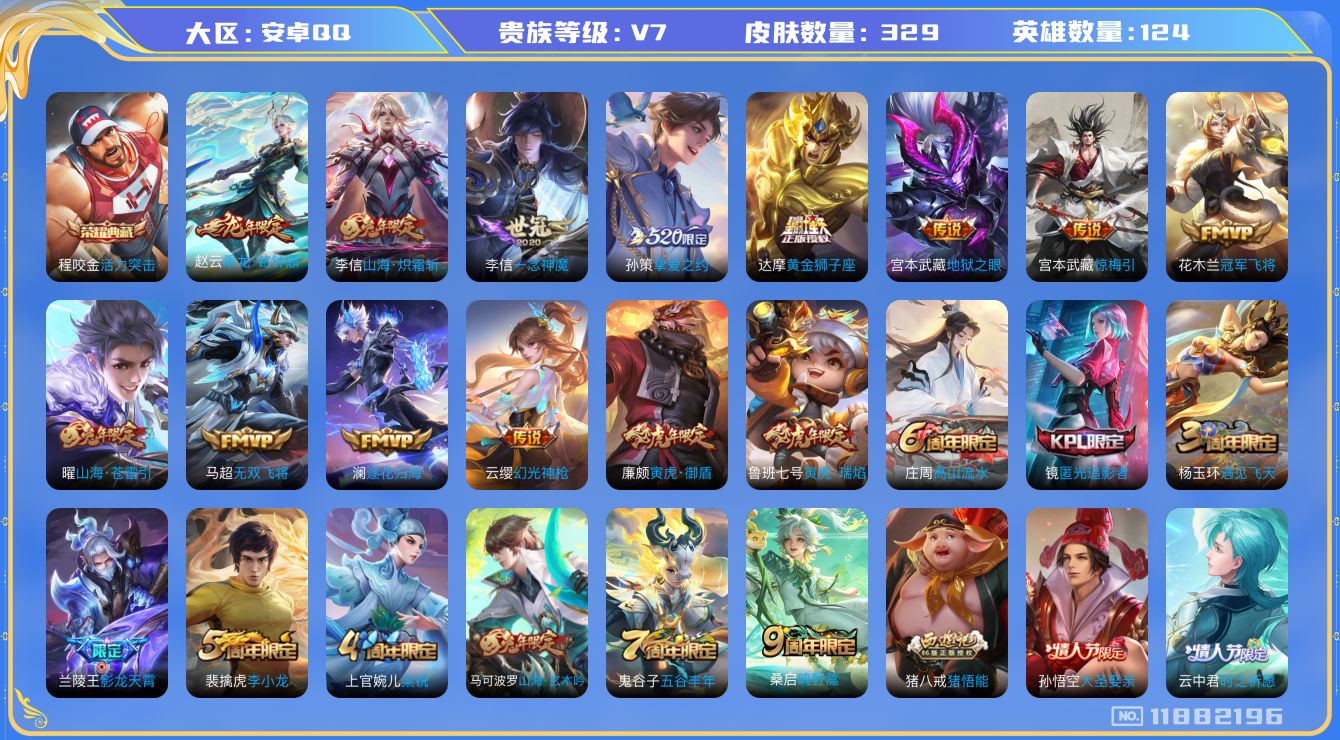 - [11685032]V7 1典藏 6传说 123英雄 235皮肤 可修改实名 优质装备:鸣剑·曳影,云鹰飞将(小将军),超时空战士-狄仁杰,山海·炽霜斩(李信年限) 传说皮:幻光神枪 珍宝阁皮:蔷薇恋人,玩趣恶龙 限定皮:愿照·九州拓(澜年限),逐霄战戟,神威(电光马子),高山流水,齐天大圣,五谷丰年,梁祝,猪悟能,青春决赛季,山海·玄木吟(马可年限) 史诗皮:鸭鸭历险记-刘禅,器灵·浮梦炉,化蝶舞,龙之律动,蔬乡物语(鲁班七号),紫霞仙子,特工魅影,永昼,电玩·爆裂旋风,江河有灵,百解令(蒙犽),高渐离燃音魔法,蒙恬荣光圣徽,偶像歌手,冰冠公主,末日机甲-吕布,猫狗日记-孙策,节奏热浪,修罗,女仆咖啡,水果甜心,星夜王子,心灵骇客,功夫厨神,德古拉伯爵,暗隐猎兽者,幽灵船长,鬼剑武藏,地狱岩魂,纤云弄巧,拒霜思,缤纷独角兽,乘风破浪,逐浪之夏,月团寄思,水晶猎龙者,金属风暴,圣诞狂欢,圣诞恋歌,鹰眼统帅,魅力维加斯,无心,未来纪元-赵云