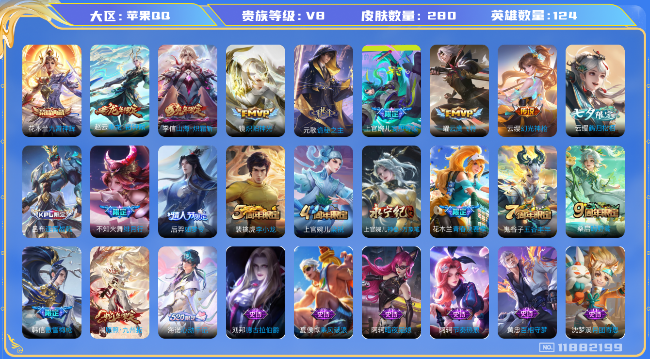 [11882199]V8 1典藏 12传说 124英雄 280皮肤 可修改实名 优质装备:九霄神辉(木兰典藏),云鹰飞将(小将军),炽阳神光,山海·炽霜斩(李信年限),妄想奇谈,鹤归松栖(云缨),诡秘之主 传说皮:乘龙·铭钟鼎(赵云年限),幻光神枪 珍宝阁皮:蔷薇恋人,玩趣恶龙 限定皮:愿照·九州拓(澜年限),逐霄战戟,鸣野蒿,傲雪梅枪,绯月行,五谷丰年,梁祝,李小龙,如梦令-后羿,青春决赛季,神器·万象笔 史诗皮:器灵·浮梦炉,星界战将,龙之律动,海诺心动手记,破空之剑,谪仙醉月,上官婉儿群星魔术团,守夜人,百相守梦-黄忠,紫霞仙子,苍穹之光,黄金分割率,特工魅影,千年之狐,永昼,电玩·爆裂旋风,江河有灵,百解令(蒙犽),蒙恬荣光圣徽,龙骑士(小龙虾),暗夜猫娘,魅语,无限星赏官,晚萤,末日机甲-吕布,猫狗日记-孙策,乱世虎臣,节奏热浪,修罗,女仆咖啡,摇滚巨星,水果甜心,星夜王子,心灵骇客,功夫厨神,德古拉伯爵,暗隐猎兽者,幽灵船长,鬼剑武藏,心灵战警,舞动绿茵,地狱岩魂,纤云弄巧,繁星吟游(呼啦呼啦),拒霜思,缤纷独角兽,乘风破浪,逐浪之夏,月团寄思,水晶猎龙者,曙光守护者,箭羽风息,金属风暴,原初追逐者,圣诞狂欢,圣诞恋歌,鹰眼统帅,魅力维加斯,赏金猎手,无心,未来纪元-赵云