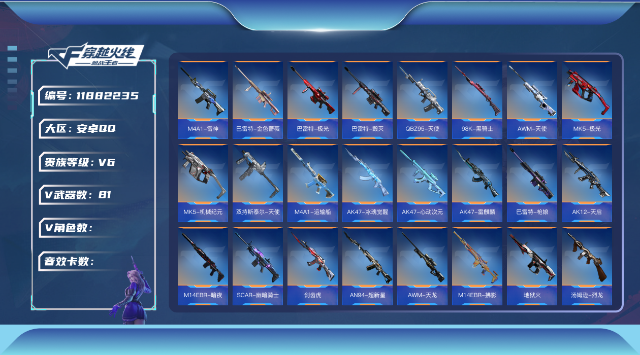 [11882235]可二次 可修改实名 V6 2王者武器 81英雄武器 165万化 枪王S 武器:王者之影,王者之魄,M4A1-雷神,巴雷特-金色蔷薇,巴雷特-极光,巴雷特-毁灭,QBZ95-天使,98K-黑骑士,AWM-天使,MK5-极光,MK5-机械纪元,双持斯泰尔-天使,M4A1-运输船,AK47-冰魂觉醒,AK47-心动次元,AK47-雷麒麟,巴雷特-枪娘,AK12-天启,M14EBR-暗夜,SCAR-幽暗骑士,剑齿虎,AN94-超新星,AWM-天龙,M14EBR-拂影,地狱火,汤姆逊-烈龙,加特林-堡垒,AK47-雅韵青花,气手枪-炼狱,沙鹰-修罗,沙鹰-宇航兔兔,沙鹰-神兵修罗,马来剑-毁灭,沙鹰-飞电,沙鹰-天神,斩魔刀,星芒,丛林匕首-庆龙觉醒,麒麟刺,秋逸,屠龙