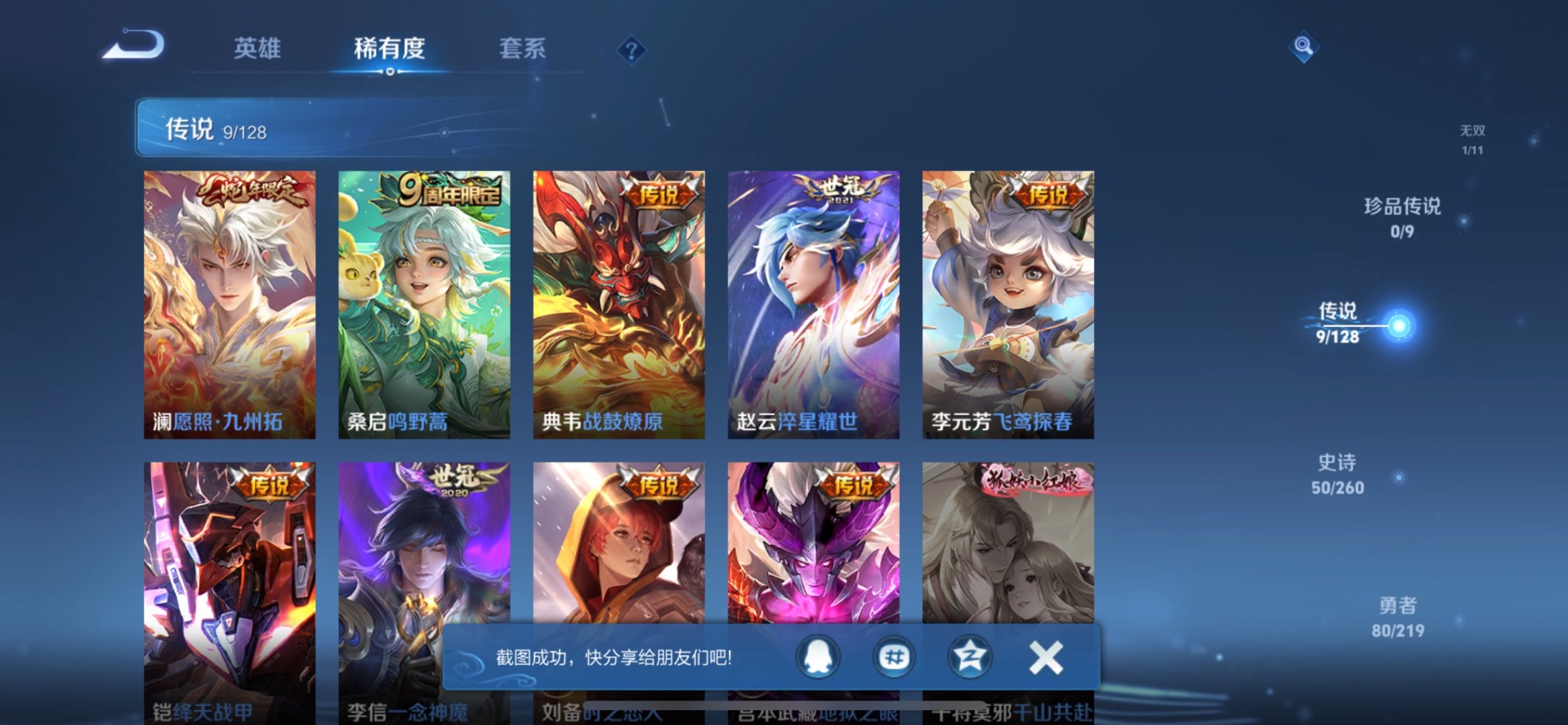 - PX_2056617-24 安卓QQ/无双王者/316皮肤/125英雄/3典藏/0珍品无双/0无双/2珍品传说/17传说/89史诗/9稀有英雄 【2 珍品传说】大耳狗之梦 瑶,器灵·落星盏 嫦娥, 【3 典藏皮肤】鸣剑·曳影 李白,全息碎影 孙悟空,拾光映像 瑶, 【17 传说皮肤】胖达荣荣 梦奇,启明星使 虞姬,云鹰飞将 曜,炽阳神光 镜,乘龙·问璇玑 孙尚香,时之恋人 刘备,乘龙·淬吴钩 孙策