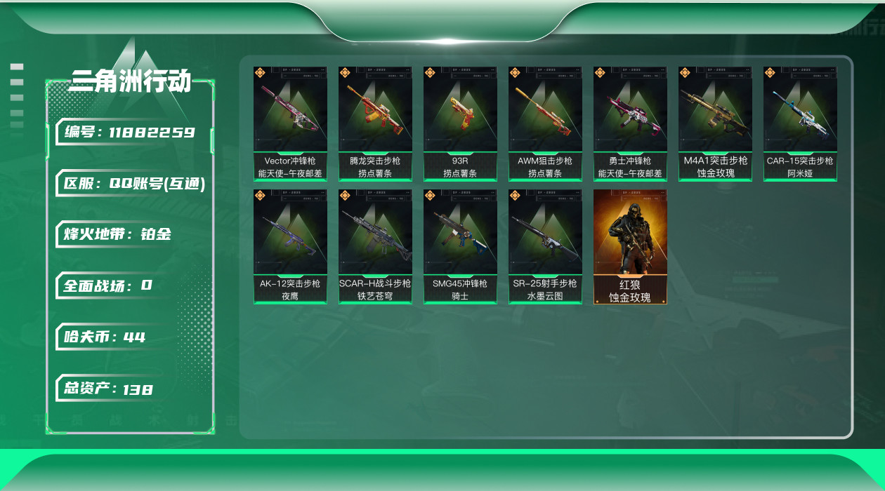 [11882259]总资产:138.5M 1干员外观 11传说枪械 哈夫币:44.557K 可二次 可修改实名 烽火地带段位:铂金 全面战场段位:无段位 传说武器皮肤:SR-25射手步枪-水墨云图,SCAR-H战斗步枪-铁艺苍穹,SMG45冲锋枪-骑士,AWM狙击步枪-捞点薯条,腾龙突击步枪-捞点薯条,93R-捞点薯条,勇士冲锋枪-能天使-午夜邮差,Vector冲锋枪-能天使-午夜邮差,CAR-15突击步枪-阿米娅,AK-12突击步枪-夜鹰,M4A1突击步枪-蚀金玫瑰 干员外观:红狼-蚀金玫瑰