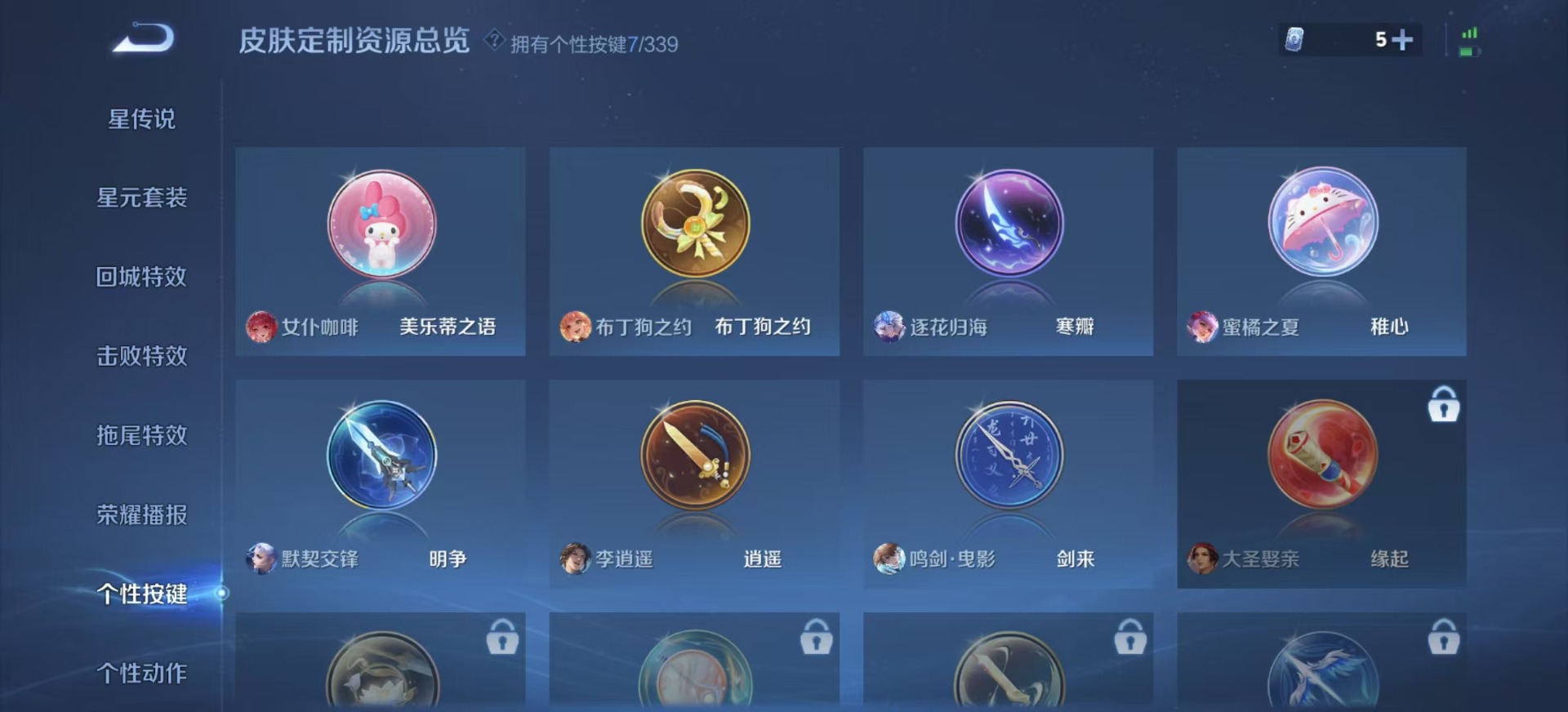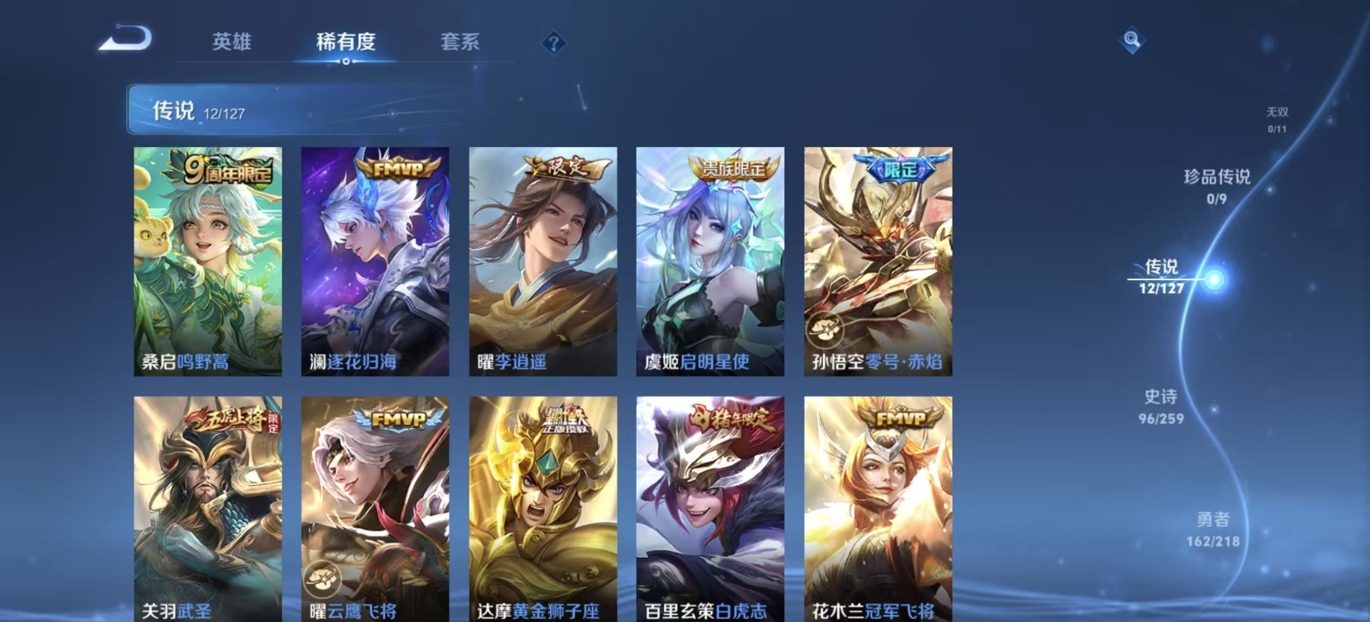 铠青龙志,苏烈玄武志,干将莫邪冰霜恋舞曲,项羽霸王别姬,露娜一生所爱,杨玉环寅虎·心曲,公孙离蜜橘之夏,裴擒虎李小龙,上官婉儿梁祝,花木兰默契交锋,花木兰瑞麟志,花木兰青春决赛季,桑启鸣野蒿,猪八戒猪悟能,孙悟空大圣娶亲,百里玄策白虎志,韩信傲雪梅枪,韩信逐梦之影,百里守约朱雀志,关羽武圣,关羽冰锋战神