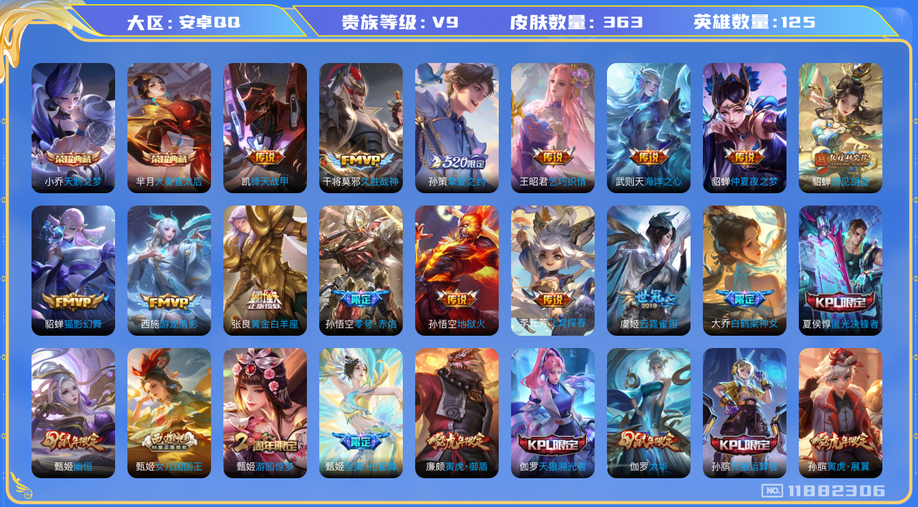 [11882306]V9 2典藏 27传说 125英雄 363皮肤 典藏英雄武则天 可修改实名 优质装备:天鹅之梦(小乔典藏),大秦宣太后,绛天战甲(鸡嘴战神),黄金白羊座,猫影幻舞,久胜战神,云霓雀翎,地狱火,仲夏夜之梦(大飞蛾),零号·赤焰,海洋之心,飞鸢探春,乞巧织情,游龙清影(小青龙),遇见胡旋,挚爱之约 珍宝阁皮:蔷薇恋人,女武神 限定皮:凤凰于飞,太华(伽罗年限),武陵仙君(小桃花),傲雪梅枪,补天,寅虎·展翼(孙膑年限),时之彼端,白鹤梁神女,魔法小厨娘,白晶晶,时雨天司(水龙头),玄嵩(庄周年限),至美·乘鲤谣,至美·化雀舞,遇见飞天,高山流水,匿光决锋者,五谷丰年,幽恒(沐浴露),天狼运算者,游园惊梦,梁祝,御风骁将(吕布年限),天狼溯光者,逐梦之音,奔雷神使(牛魔年限),祈雪灵祝(雪兔子),天狼绘梦者,李小龙,逐梦之光,如梦令-后羿,霸王别姬-项羽,霸王别姬-虞姬,奇迹圣诞,默契交锋-兰陵王,默契交锋-花木兰,孙行者,猪悟能,天魔缭乱,冰霜恋舞曲,乒乒小将,热情桑巴,女儿国国王,寅虎·御盾(廉颇年限),寅虎·瑞焰(虎皮蛋子),寅虎·心曲(虎婆),寅虎·赤拳(老虎年限),时之祈愿-瑶(瑶传限),无尽星芒 史诗皮:化蝶舞,龙之律动,百相守梦-周瑜,守夜人,紫霞仙子,苍穹之光,电玩小子(小书包),特工魅影,江河有灵,百解令(蒙犽),蒙恬荣光圣徽,偶像歌手,龙骑士(小龙虾),暗夜猫娘,魅语,冰冠公主,青蛇,时之恋人-孙尚香,乱世虎臣,节奏热浪,女仆咖啡,摇滚巨星,水果甜心,绅士熊喵,天才门将,星夜王子,心灵骇客,时之奇旅-安琪拉,功夫厨神,德古拉伯爵,暗隐猎兽者,幽灵船长,鬼剑武藏,心灵战警,舞动绿茵,地狱岩魂,诗语江南,纤云弄巧,繁星吟游(呼啦呼啦),拒霜思,缤纷独角兽,乘风破浪,逐浪之夏,水晶猎龙者,曙光守护者,箭羽风息,唤灵魅影,金属风暴,原初追逐者,圣诞狂欢,圣诞恋歌,鹰眼统帅,魅力维加斯,黎明之约,奇遇舞章,天秀·音浪,寅虎·御盾,千筹问战,无心,未来纪元-赵云