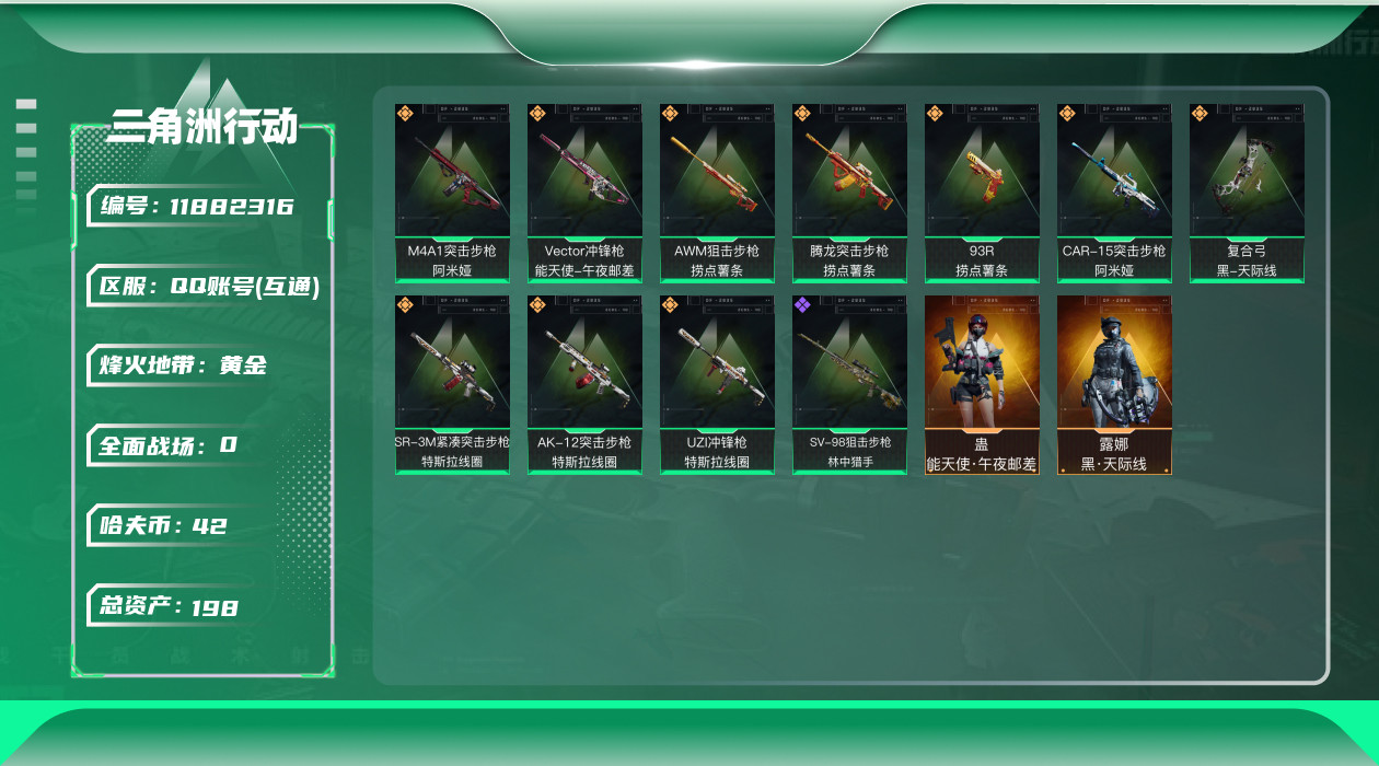 [11882316]总资产:198.7M 2干员外观 10传说枪械 哈夫币:42.133K 顶级安全箱(3×3)9.15号到期 可二次 可修改实名 优质装备:顶级安全箱(3x3) 烽火地带段位:黄金 全面战场段位:无段位 传说武器皮肤:M4A1突击步枪-阿米娅,CAR-15突击步枪-阿米娅,复合弓-黑-天际线,AWM狙击步枪-捞点薯条,腾龙突击步枪-捞点薯条,93R-捞点薯条,AK-12突击步枪-特斯拉线圈,SR-3M紧凑突击步枪-特斯拉线圈,UZI冲锋枪-特斯拉线圈,Vector冲锋枪-能天使-午夜邮差 史诗武器皮肤:SV-98狙击步枪-林中猎手 干员外观:露娜-黑·天际线,蛊-能天使·午夜邮差