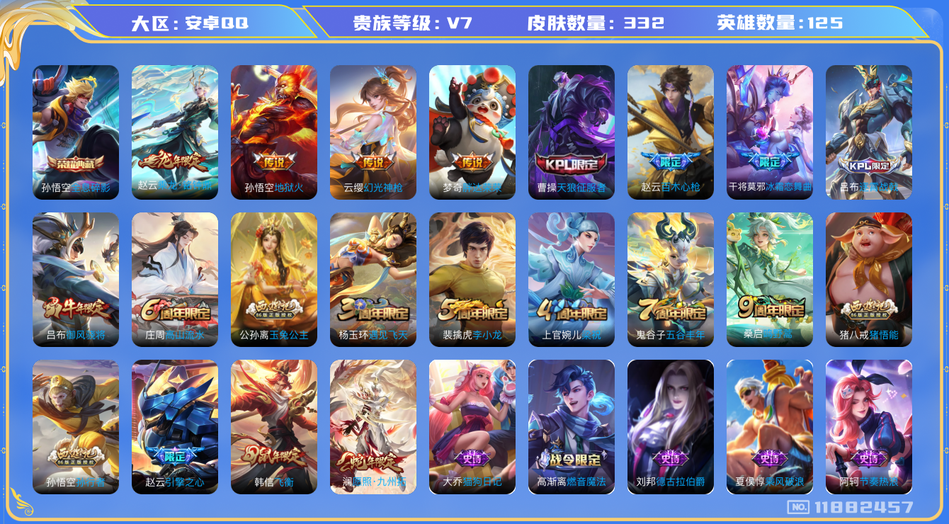 [11882457]V7 1典藏 6传说 125英雄 332皮肤 可修改实名 女号 优质装备:全息碎影(猴子典藏),地狱火,胖达荣荣 传说皮:乘龙·铭钟鼎(赵云年限),幻光神枪 珍宝阁皮:优雅恋人,蔷薇恋人,女武神 限定皮:愿照·九州拓(澜年限),逐霄战戟,鸣野蒿,飞衡(韩信年限),遇见飞天,高山流水,五谷丰年,梁祝,御风骁将(吕布年限),天狼征服者,李小龙,孙行者,猪悟能,引擎之心,冰霜恋舞曲,百木心枪,玉兔公主 史诗皮:化蝶舞,龙之律动,石田雨龙,谪仙醉月,决胜骁骑,蔬乡物语(鲁班七号),百相守梦-黄忠,紫霞仙子,电玩小子(小书包),白龙吟,黄金分割率,特工魅影,千年之狐,电玩·爆裂旋风,江河有灵,百解令(蒙犽),高渐离燃音魔法,晚萤,末日机甲-吕布,猫狗日记-孙策,猫狗日记-大乔,时之恋人-孙尚香,节奏热浪,修罗,女仆咖啡,摇滚巨星,水果甜心,绅士熊喵,星夜王子,心灵骇客,德古拉伯爵,暗隐猎兽者,幽灵船长,鬼剑武藏,暗渊魔法,心灵战警,天秀·启明,舞动绿茵,地狱岩魂,纤云弄巧,繁星吟游(呼啦呼啦),拒霜思,缤纷独角兽,乘风破浪,逐浪之夏,水晶猎龙者,曙光守护者,热力回旋,金属风暴,圣诞狂欢,圣诞恋歌,鹰眼统帅,暗夜贵公子,无心,未来纪元-赵云