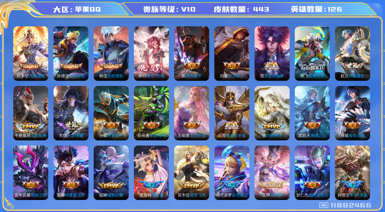 [11882466]V10 3典藏 1无双 40传说 126英雄 443皮肤 典藏英雄武则天 可修改实名 优质装备:全息碎影(猴子典藏),九霄神辉(木兰典藏),弑枪猎影(韩信典藏),青丘·九尾(妲己无双),黄金射手座,冠军飞将,云鹰飞将(小将军),绛天战甲(鸡嘴战神),猫影幻舞,久胜战神,炽阳神光,一念神魔,云霓雀翎,末日机甲-孙尚香(绿蚂蚱),地狱火,仲夏夜之梦(大飞蛾),零号·赤焰,海洋之心,地狱之眼,音你心动-周瑜,胖达荣荣,李逍遥,乞巧织情,时之恋人-刘备(电焊工),淬星耀世,超时空战士-狄仁杰,末日机甲-孙策,浮生妄,青丘·九尾,百相守梦(张飞),妄想实况,艾琳觅芳踪,涂山容容 传说皮:铠冥王哈迪斯,幻光神枪 珍宝阁皮:优雅恋人,女武神 限定皮:愿照·九州拓(澜年限),鸣野蒿,至尊宝,白虎志(电光耗子),凤求凰(白切鸡),凤凰于飞,梅西,武陵仙君(小桃花),傲雪梅枪,时之彼端,魔法小厨娘,白晶晶,时雨天司(水龙头),神威(电光马子),飞衡(韩信年限),山海·碧波行(瑶年限),至美·乘鲤谣,遇见飞天,高山流水,诗剑行,青龙志(铠年限),冰锋战神,武圣,天狼运算者,游园惊梦,梁祝,天狼狩猎者,龙胆,逐梦之星,烈魂,岱宗(典韦年限),天狼溯光者,天狼征服者,天狼绘梦者,李小龙,逐梦之影,逐梦之光,朱雀志(守约年限),永曜之星,辉光之辰,如梦令-嫦娥,如梦令-后羿,霸王别姬-项羽,霸王别姬-虞姬,真爱至上,孙行者,大圣娶亲,天魔缭乱,冰霜恋舞曲,神奇女侠,时之祈愿-云中君,玉兔公主 史诗皮:器灵·浮梦炉,星界战将,谪仙醉月,龙之律动,石田雨龙,怒海争锋,芈月浮光幕影,海诺心动手记,决胜骁骑,蔬乡物语(鲁班七号),乘龙·聚宝船(安琪拉年限),百相守梦-黄忠,紫霞仙子,苍穹之光,电玩小子(小书包),白龙吟,黄金分割率,特工魅影,千年之狐,江河有灵,雪夜绮愿(周瑜),魅语,百解令(蒙犽),高渐离燃音魔法,蒙恬荣光圣徽,无限星赏官,冰冠公主,青蛇,偶像歌手,白蛇,晚萤,电玩·爆裂旋风,百相守梦(刘备),暗夜猫娘,百相守梦(关羽),龙骑士(小龙虾),末日机甲-吕布,猫狗日记-孙策,猫狗日记-大乔,时之恋人-孙尚香,乱世虎臣,节奏热浪,修罗,女仆咖啡,摇滚巨星,水果甜心,绅士熊喵,天才门将,星夜王子,心灵骇客,时之奇旅-安琪拉,功夫厨神,德古拉伯爵,暗隐猎兽者,幽灵船长,鬼剑武藏,暗渊魔法,