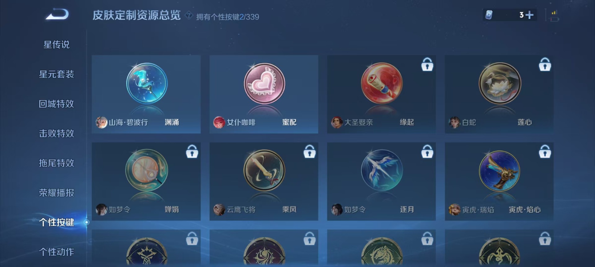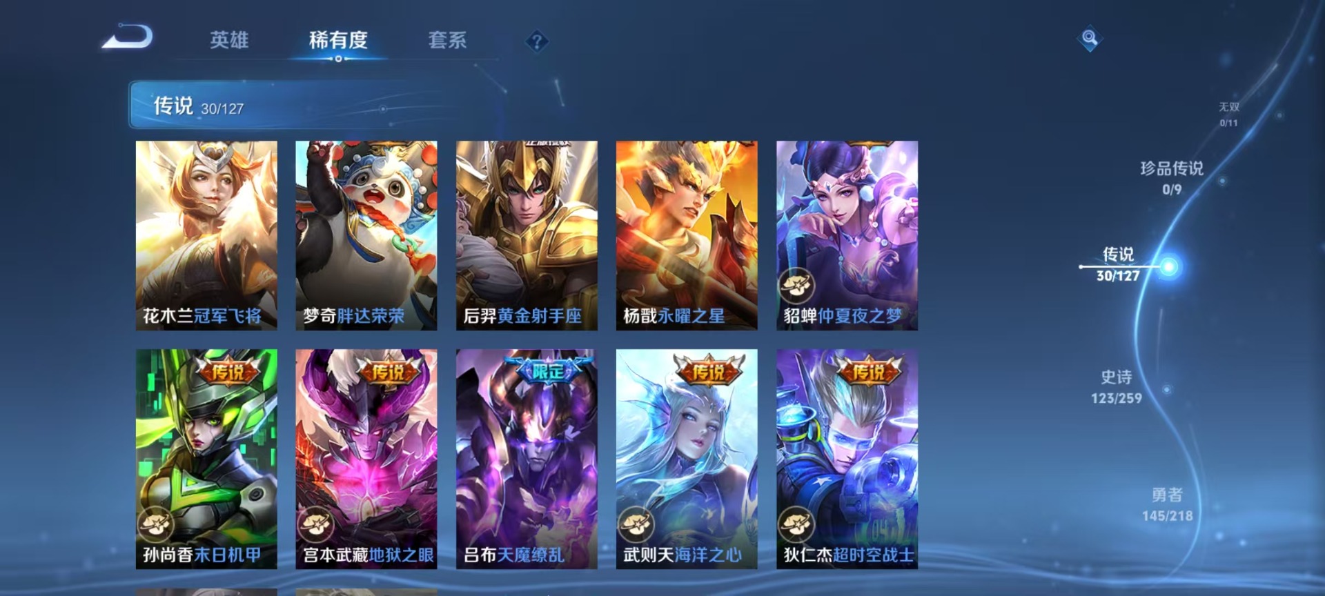 黄忠烈魂,甄姬幽恒,铠青龙志,廉颇寅虎·御盾,曹操天狼征服者,伽罗天狼溯光者,伽罗太华,赵云百木心枪,孙膑天狼运算者,小乔纯白花嫁,典韦岱宗,孙尚香异界灵契,牛魔奔雷神使,后羿如梦令,后羿辉光之辰,庄周玄嵩,镜匿光追影者,裴擒虎李小龙,裴擒虎寅虎·赤拳,上官婉儿梁祝,上官婉儿天狼绘梦者,猪八戒猪悟能,孙悟空孙行者,芈月白晶晶,孙悟空至尊宝,百里玄策白虎志,马超神威,云中君时之祈愿,妲己时之彼端,妲己时之奇旅,韩信傲雪梅枪,韩信飞衡,韩信逐梦之影,百里守约朱雀志,瑶时之祈愿,瑶山海·碧波行,妲己热情桑巴,嫦娥如梦令