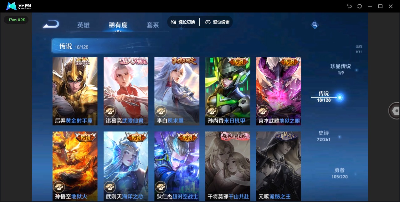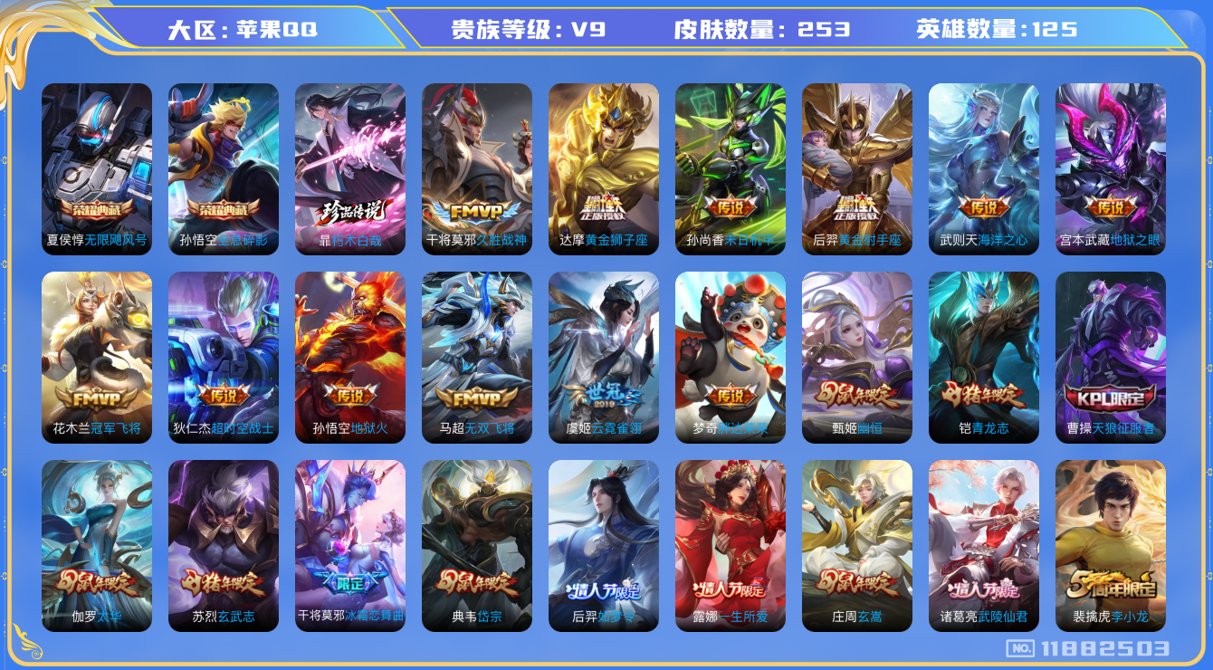 [11882503]V9 2典藏 1珍品传说 18传说 125英雄 253皮肤 典藏英雄武则天 可修改实名 优质装备:无限飓风号(高达),全息碎影(猴子典藏),朽木白哉,黄金狮子座,黄金射手座,冠军飞将,久胜战神,云霓雀翎,末日机甲-孙尚香(绿蚂蚱),地狱火,海洋之心,地狱之眼,胖达荣荣,超时空战士-狄仁杰,无双飞将,涂山容容 珍宝阁皮:妄想食味 限定皮:鸣野蒿,白虎志(电光耗子),凤求凰(白切鸡),凤凰于飞,太华(伽罗年限),武陵仙君(小桃花),时之彼端,魔法小厨娘,飞衡(韩信年限),玄嵩(庄周年限),瑞麟志(木兰年限),五谷丰年,青龙志(铠年限),幽恒(沐浴露),梁祝,天狼狩猎者,岱宗(典韦年限),天狼征服者,李小龙,逐梦之光,玄武志(苏烈年限),朱雀志(守约年限),如梦令-嫦娥,如梦令-后羿,奇迹圣诞,一生所爱,大圣娶亲,引擎之心,冰霜恋舞曲,神奇女侠 史诗皮:鸭鸭历险记-刘禅,龙之律动,石田雨龙,白龙吟,蒙恬荣光圣徽,无限星赏官,冰冠公主,偶像歌手,龙骑士(小龙虾),末日机甲-吕布,猫狗日记-孙策,猫狗日记-大乔,乱世虎臣,节奏热浪,摇滚巨星,水果甜心,天才门将,星夜王子,功夫厨神,幽灵船长,鬼剑武藏,舞动绿茵,繁星吟游(呼啦呼啦),缤纷独角兽,乘风破浪,逐浪之夏,月团寄思,曙光守护者,箭羽风息,金属风暴,原初追逐者,圣诞狂欢,圣诞恋歌,鹰眼统帅,暗夜贵公子,无心,未来纪元-赵云