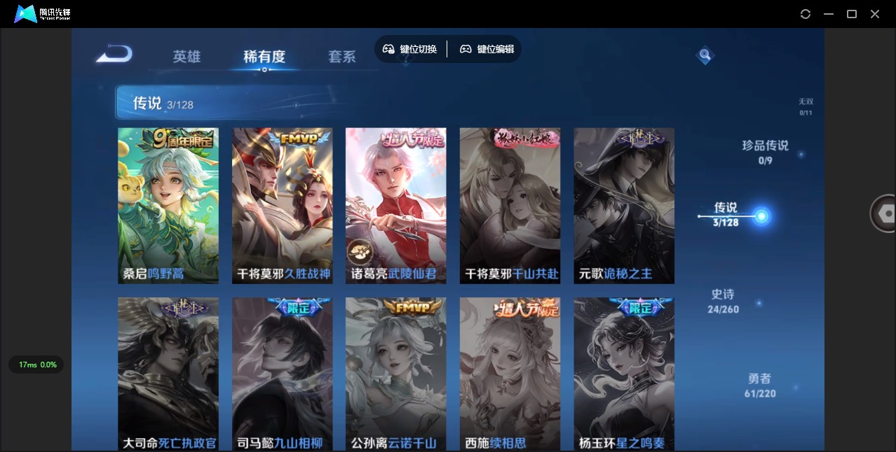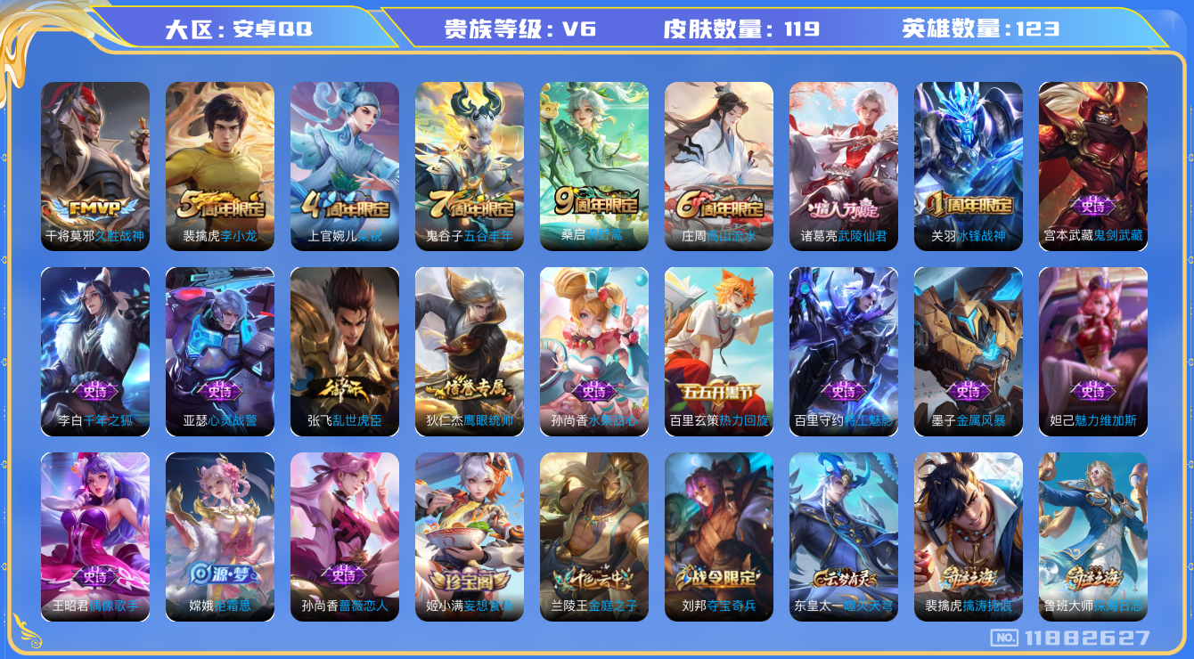 [11882627]V6 3传说 123英雄 119皮肤 可修改实名 优质装备:久胜战神 珍宝阁皮:妄想食味,蔷薇恋人 限定皮:鸣野蒿,武陵仙君(小桃花),高山流水,五谷丰年,冰锋战神,梁祝,李小龙 史诗皮:特工魅影,千年之狐,偶像歌手,乱世虎臣,水果甜心,鬼剑武藏,心灵战警,拒霜思,热力回旋,金属风暴,鹰眼统帅,魅力维加斯