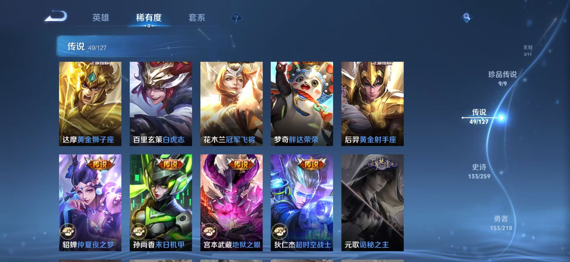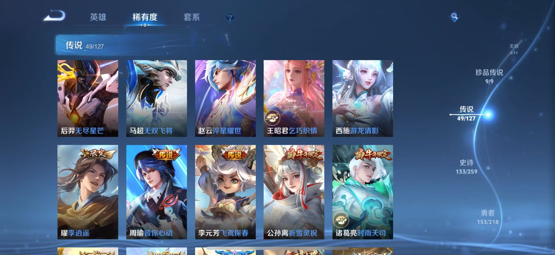 刘备时之恋人,赵云淬星耀世,干将莫邪久胜战神,李信一念神魔,达摩黄金狮子座,王昭君乞巧织情,露娜霜月吟,镜炽阳神光,周瑜音你心动,杨玉环星之鸣奏,裴擒虎祥瑞亨通,貂蝉猫影幻舞,夏洛特浮生妄,艾琳觅芳踪,西施游龙清影,嬴政玄雷天君,孙悟空零号·赤焰,曜云鹰飞将,曜李逍遥,马超无双飞将,李元芳飞鸢探春,虞姬云霓雀翎,云缨幻光神枪