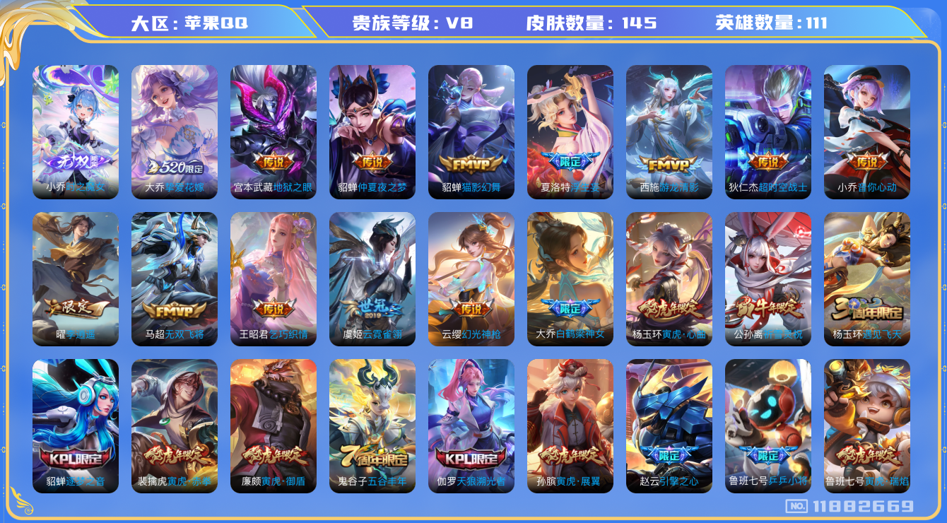 [11882669]V8 1无双 18传说 111英雄 145皮肤 可修改实名 优质装备:小乔时之魔女(小乔无双),猫影幻舞,云霓雀翎,仲夏夜之梦(大飞蛾),音你心动-小乔,地狱之眼,李逍遥,乞巧织情,游龙清影(小青龙),超时空战士-狄仁杰,挚爱花嫁,无双飞将,浮生妄 传说皮:幻光神枪 珍宝阁皮:女武神 限定皮:愿照·岁时盈(虞姬年限),寅虎·展翼(孙膑年限),白鹤梁神女,遇见飞天,五谷丰年,天狼溯光者,逐梦之音,祈雪灵祝(雪兔子),如梦令-嫦娥,一生所爱,引擎之心,乒乒小将,寅虎·御盾(廉颇年限),寅虎·瑞焰(虎皮蛋子),寅虎·心曲(虎婆),寅虎·赤拳(老虎年限) 史诗皮:茶境仙,遇见神鹿,紫霞仙子,特工魅影,魅语,晚萤,时之恋人-孙尚香,节奏热浪,女仆咖啡,摇滚巨星,水果甜心,心灵骇客,暗隐猎兽者,幽灵船长,地狱岩魂,缤纷独角兽,水晶猎龙者,唤灵魅影,金属风暴,圣诞狂欢,圣诞恋歌,鹰眼统帅,魅力维加斯,奇遇舞章,寅虎·御盾,无心
