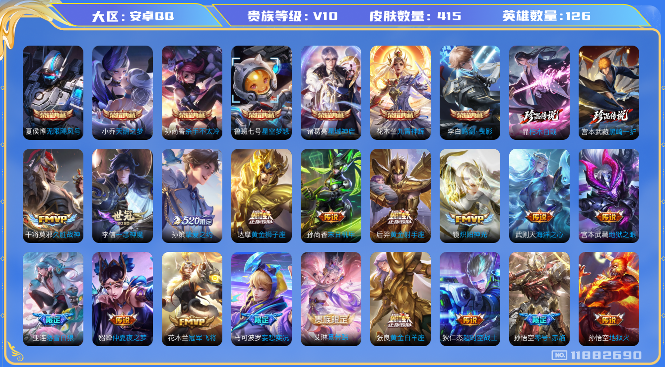 - [11972350]V7 1典藏 1珍品传说 13传说 122英雄 262皮肤 可修改实名 优质装备:全息碎影(猴子典藏),怪盗基德,黄金射手座,炽阳神光,云霓雀翎,地狱火,地狱之眼,游龙清影(小青龙),淬星耀世,琥珀纪元铠 传说皮:乘龙·铭钟鼎(赵云年限),幻光神枪 珍宝阁皮:妄想食味,胡桃夹子 限定皮:愿照·九州拓(澜年限),愿照·山河定(司空震年限),逐霄战戟,鸣野蒿,傲雪梅枪,五谷丰年,李小龙,孙行者,大圣娶亲 史诗皮:鸭鸭历险记-刘禅,化蝶舞,龙之律动,茶境仙,破空之剑,东方月初,蒙犽顽岩魄,蔬乡物语(鲁班七号),乘龙·聚宝船(安琪拉年限),乘龙·忆丹青(大乔年限),紫霞仙子,特工魅影,永昼,江河有灵,魅语,百解令(蒙犽),高渐离燃音魔法,无限星赏官,冰冠公主,青蛇,偶像歌手,末日机甲-吕布,猫狗日记-孙策,猫狗日记-大乔,女仆咖啡,摇滚巨星,水果甜心,天才门将,功夫厨神,幽灵船长,鬼剑武藏,心灵战警,地狱岩魂,纤云弄巧,拒霜思,乘风破浪,逐浪之夏,水晶猎龙者,曙光守护者,原初追逐者,圣诞恋歌,鹰眼统帅,魅力维加斯,赏金猎手,未来纪元-赵云