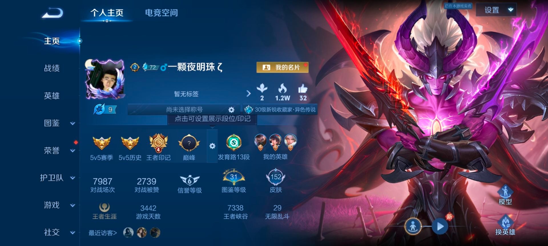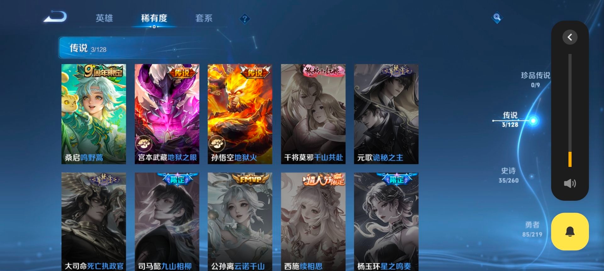 - PX_2095315-实名: 可修改 性别: 男号 贵族等级: V9 英雄数: 125 皮肤数: 387 荣耀水晶: 九霄神辉,弑枪猎影,最初的交响 无双皮: 韩信群星魔术团,雪境奇遇-甄姬,器灵·螭龙剑 珍品传说: 器灵·落星盏,朽木白哉,黑崎一护 星传说: 幽冥之眼,时之思念,玉鸾吟 传说皮: 黄金狮子座,黄金射手座,冠军飞将,猫影幻舞,久胜战神,炽阳神光,一念神魔,零号·赤焰,地狱之眼,胖达