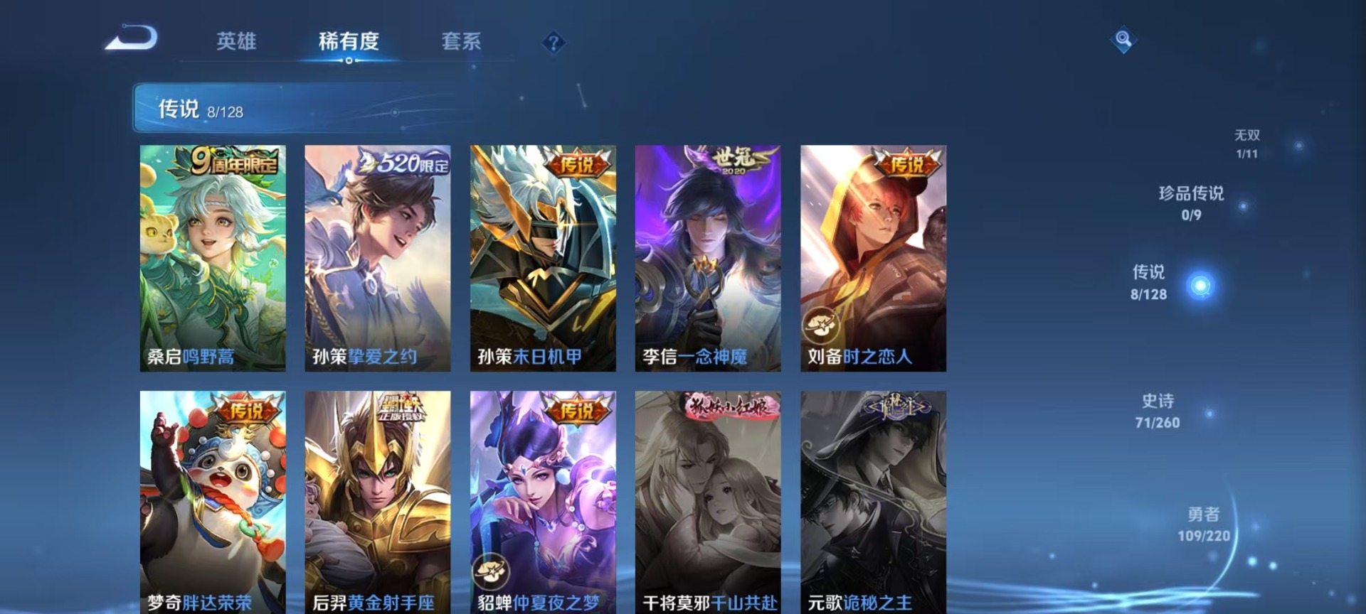- PX_2053769-安卓Q 【包人脸】 英雄数量:122 皮肤数量:215 贵族等级:贵族V8 传说数量:0 荣耀典藏3 传说品质4 史诗品质68鸣剑曳影 全息碎影 大秦宣太后 凤求凰 诗剑行 绛天战甲 启明星使 天才门将 功夫厨神 狮舞东方 鬼剑武藏 魅力维加斯 皇家上将 繁星吟游 暗隐猎兽者 德古拉伯爵 幽灵船长 乘风破浪 未来纪元赵云 金属风暴 地狱岩魂 飞衡 傲雪梅枪 天狼绘梦者 浮光幕